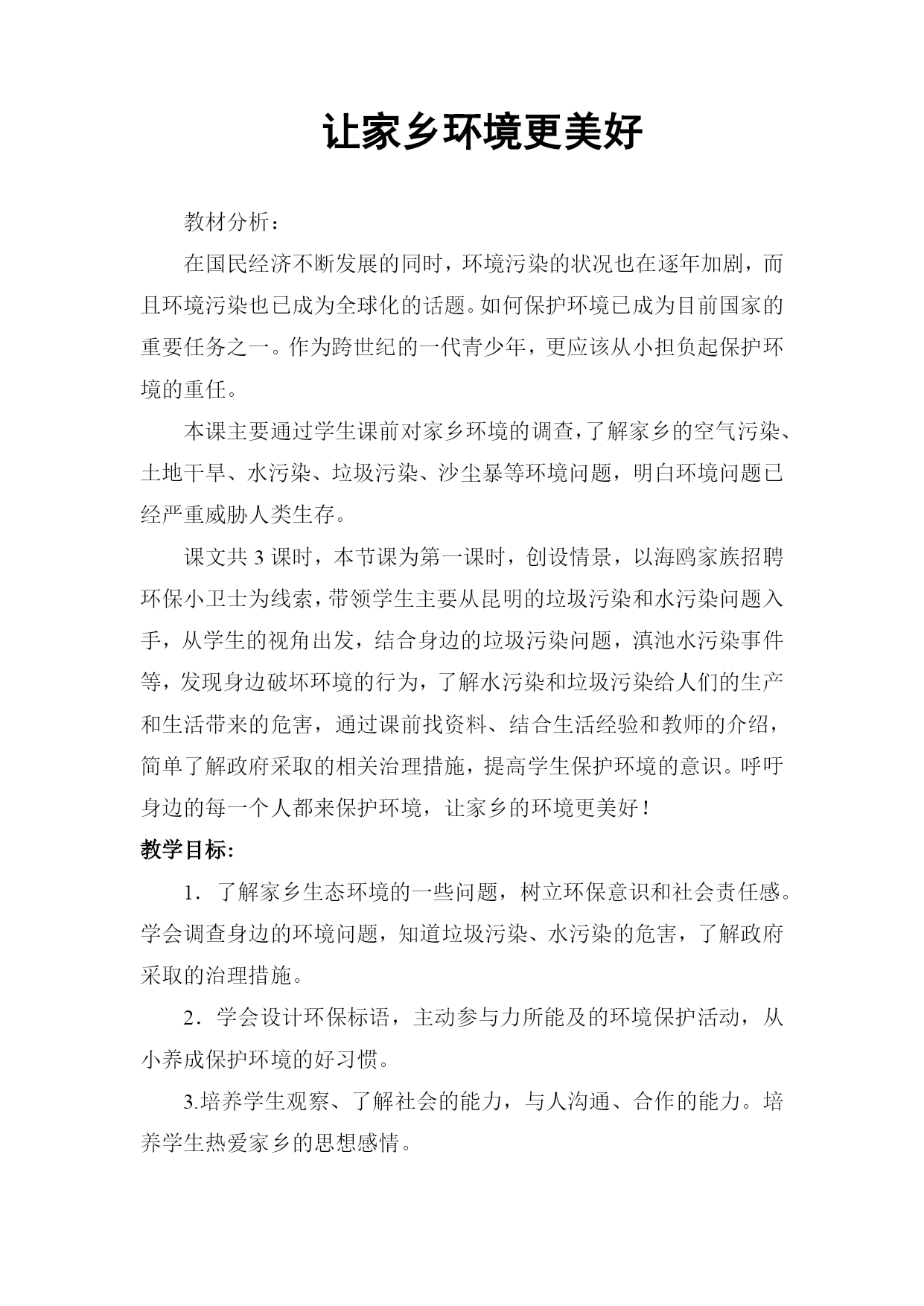 让家乡环境更美好教材分析:在国民经济不断发展的同时,环境污染的状况也在逐年加剧,而且环境污染也已成为全球化的话题。如何保护环境已成为目前国家的重要任务之一。作为跨世纪的一代青少年,更应该从小担负起保护环境的重任。本课主要通过学生课前对家乡环境的调查,了解家乡的空气污染、土地干旱、水污染、垃圾污染、沙尘暴等环境问题,明白环境问题已经严重威胁人类生存。课文共3课时,本节课为第一课时,创设情景,以海鸥家族招聘环保小卫士为线索,带领学生主要从昆明的垃圾污染和水污染问题入手,从学生的视角出发,结合身边的垃圾污染问题
