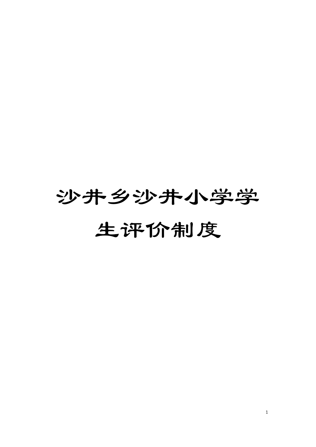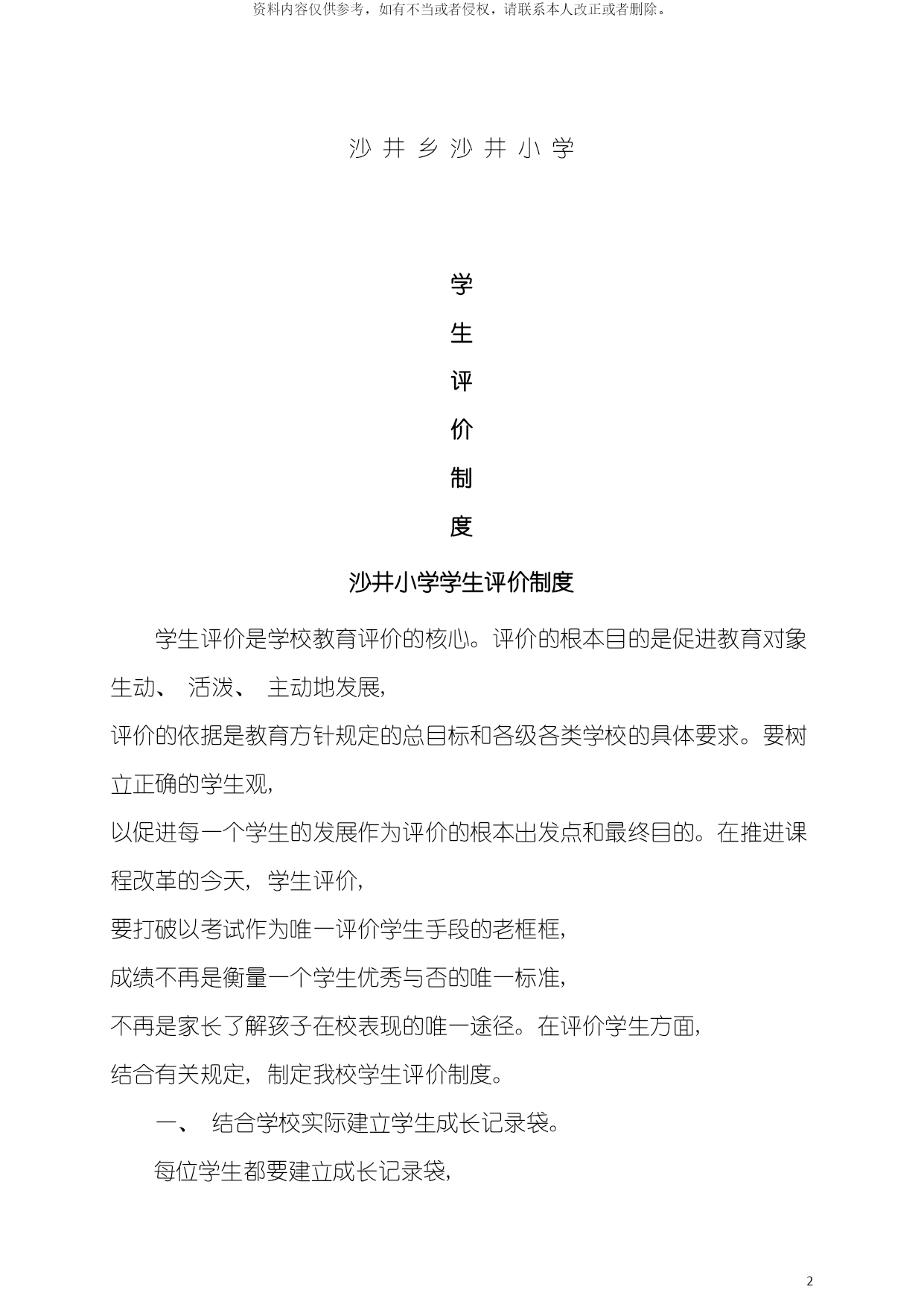 沙井乡沙井小学学生评价制度沙井小学学生评价制度学生评价是学校教育评价的核心。评价的根本目的是促进教育对象生动、活泼、主动地发展,评价的依据是教育方针规定的总目标和各级各类学校的具体要求。要树立正确的学生观,以促进每一个学生的发展作为评价的根本出发点和最终目的。在推进课程改革的今天,学生评价,要打破以考试作为唯一评价学生手段的老框框,成绩不再是衡量一个学生优秀与否的唯一标准,不再是家长了解孩子在校表现的唯一途径。在评价学生方面,结合有关规定,制定我校学生评价制度。一、结合学校实际建立学生成长记录袋。每位学生