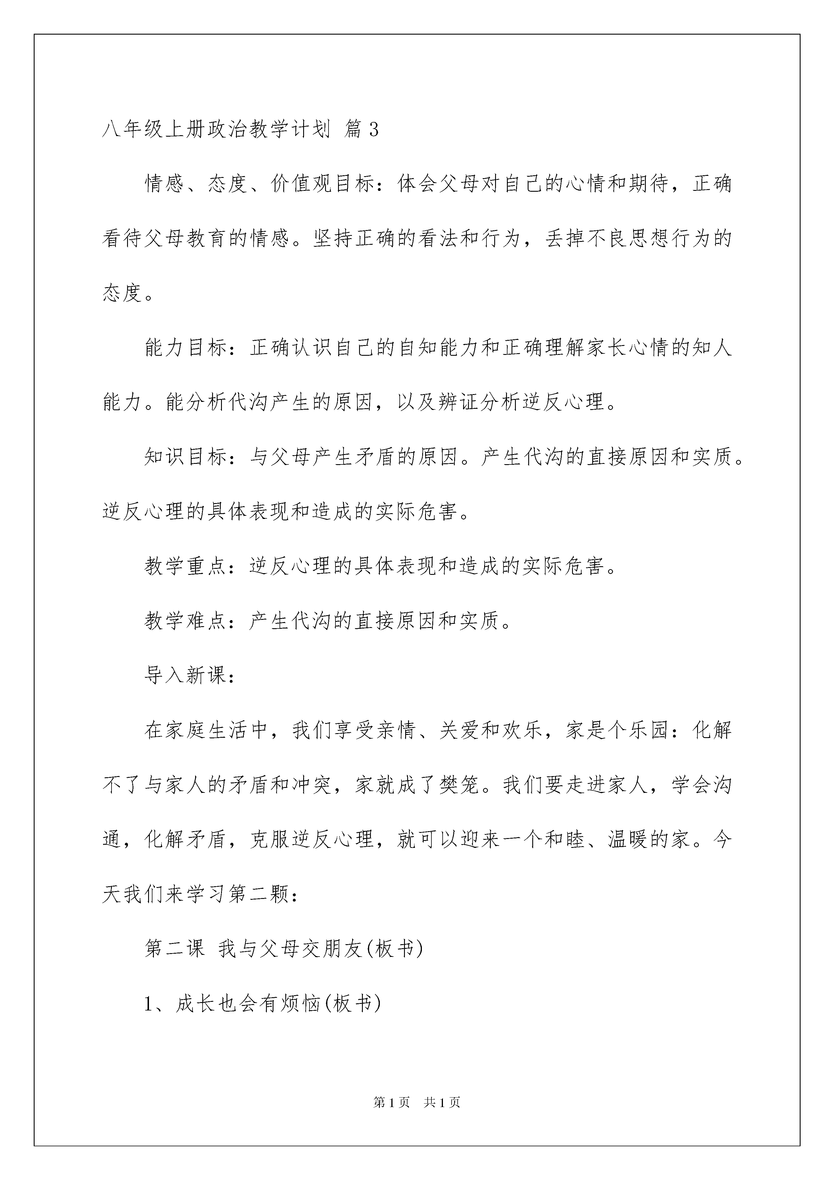 2022八年级上册政治教学计划范文锦集十篇.docx