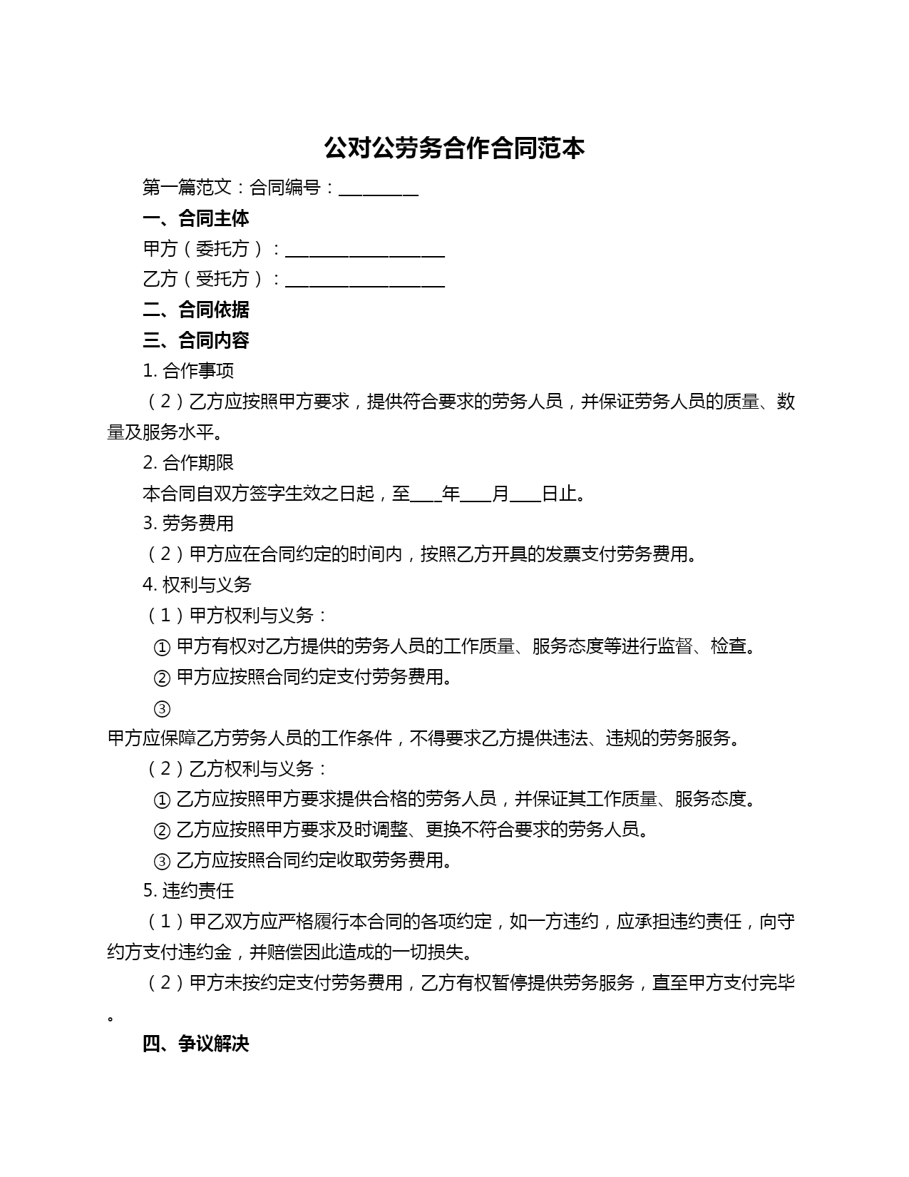 公对公劳务合作合同范本第一篇范文:合同编号:__________一、合同主体甲方(委托方):____________________乙方(受托方):____________________二、合同依据三、合同内容1.合作事项(2)乙方应按照甲方要求,提供符合要求的劳务人员,并保证劳务人员的质量、数量及服务水平。2.合作期限本合同自双方签字生效之日起,至____年____月____日止。3.劳务费用(2)甲方应在合同约定的时间内,按照乙方开具的发票支付劳务费用。4.权利与义务(1)甲方权利与义务:①甲方有权