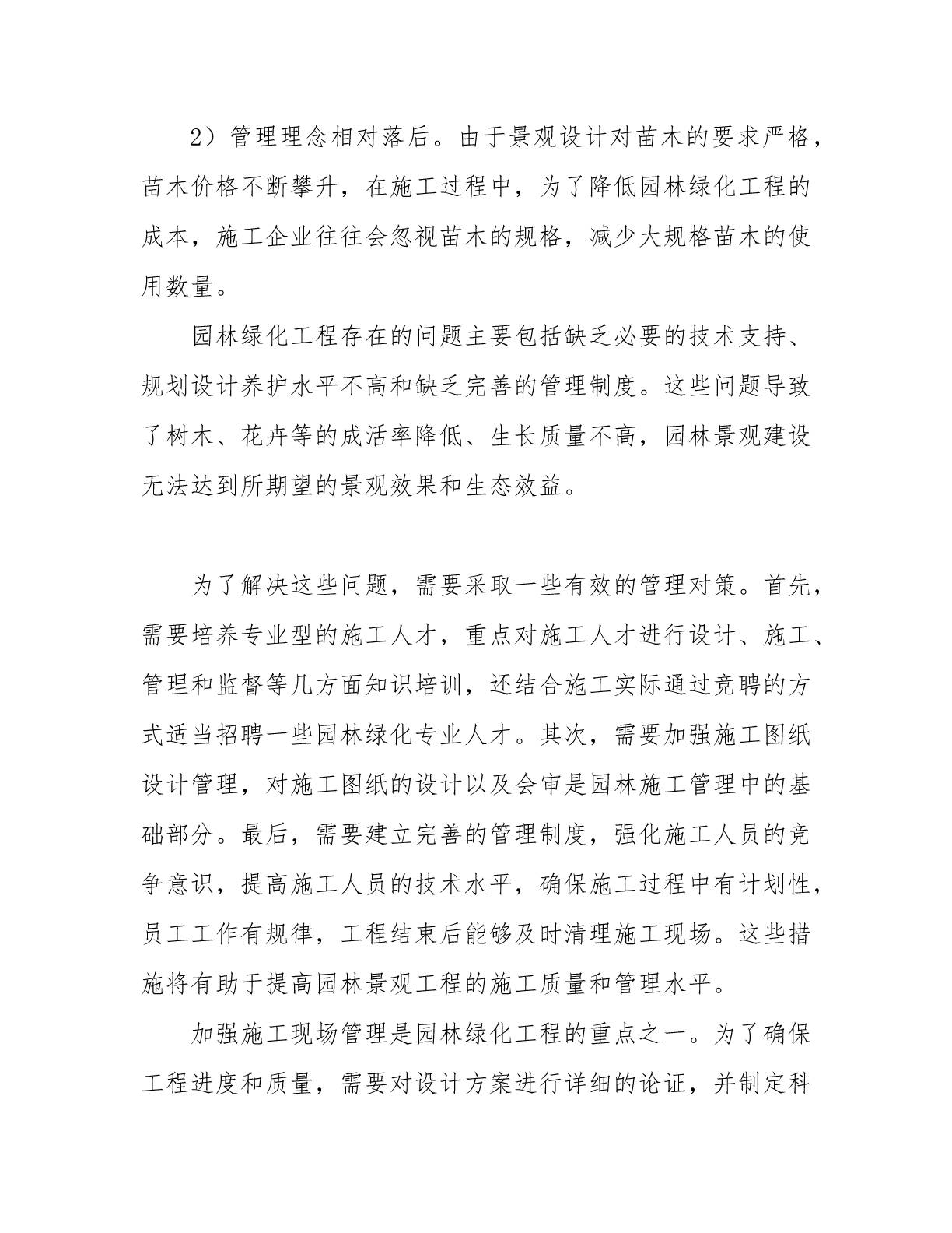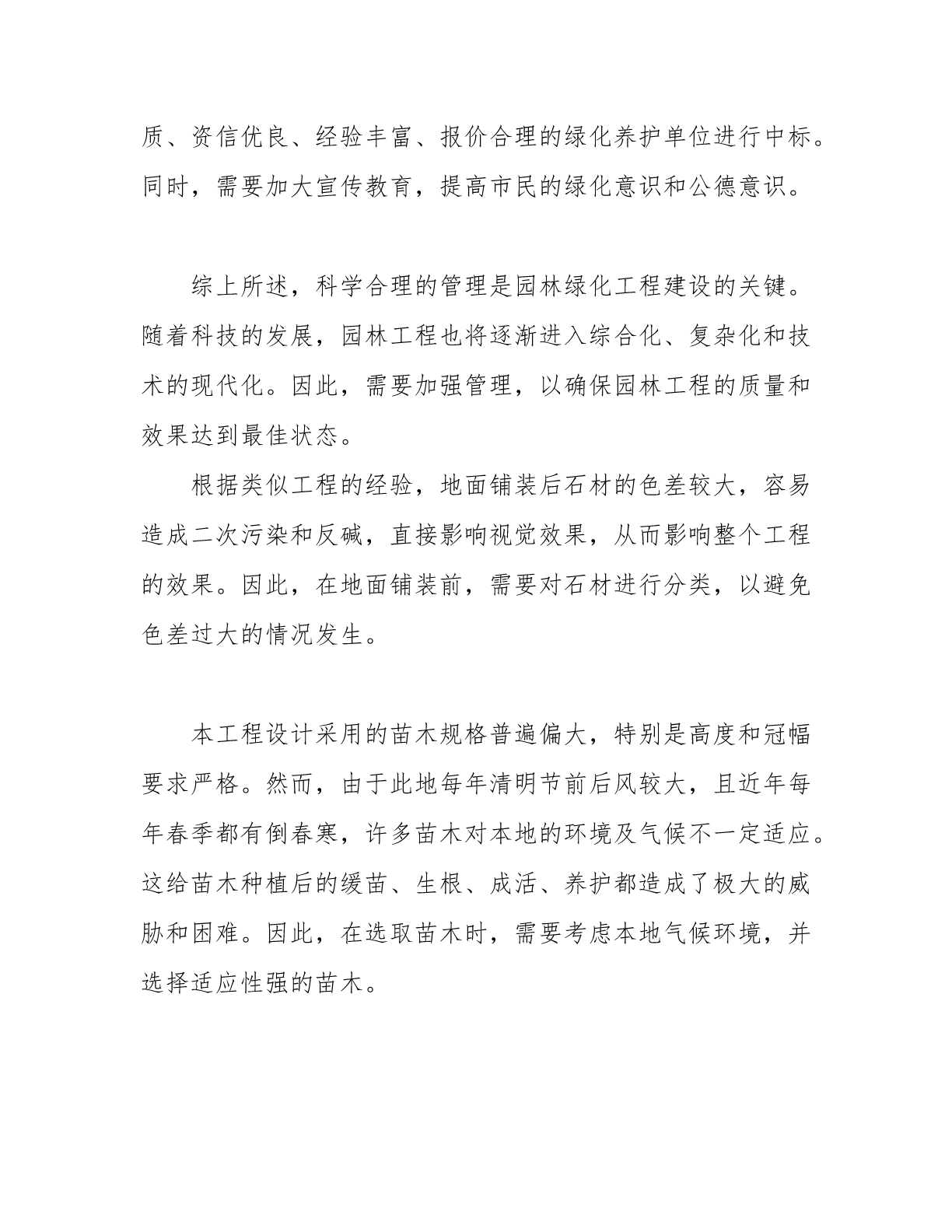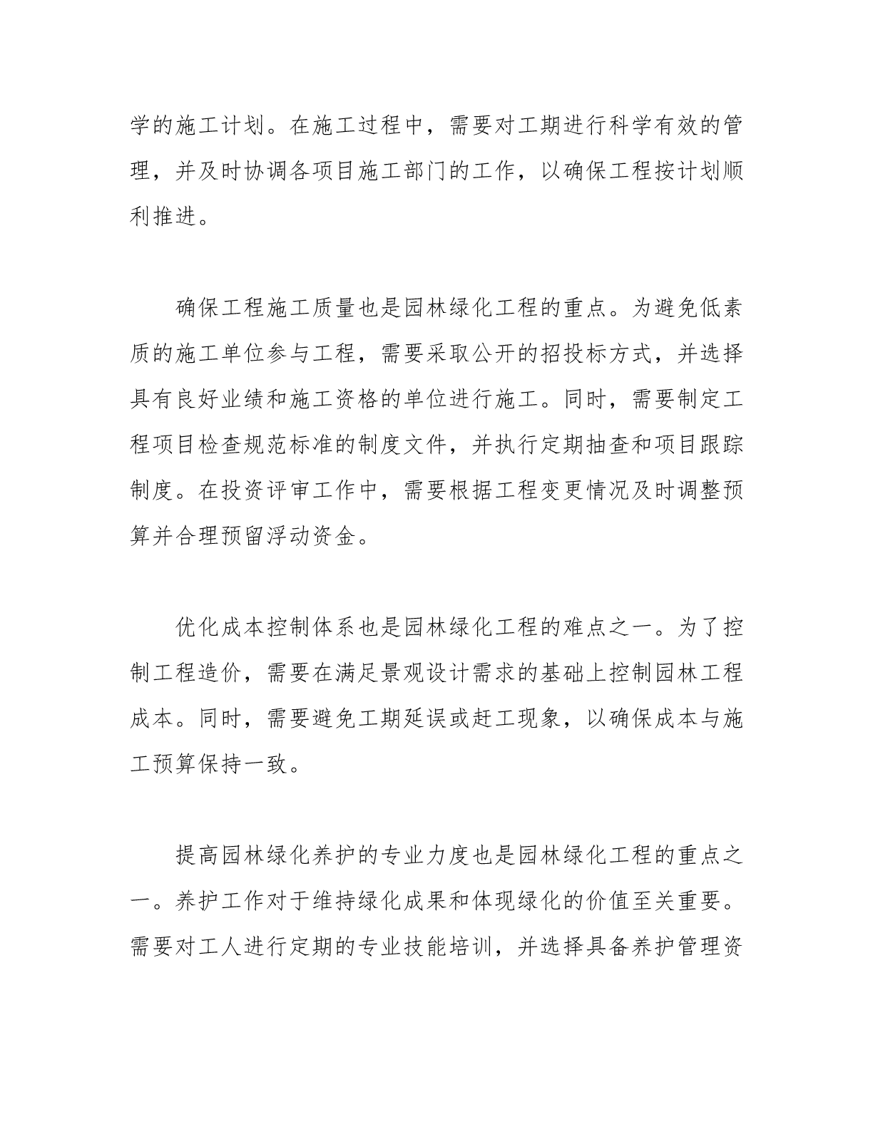 园林绿化工程的施工特点、重点和难点目前我国园林建设仍处于发展状态,系统学习过园林建设的专业人员稀少,园林建设技术水准相对薄弱。管理者应该提高自身对园林管理的认识,着重提升自身知识和能力,结合当前我国园林施工管理的发展情况来提高管理能力,为我国园林建设和施工管理的现代化发展贡献一份力量。1、园林景观的施工特点(1)涉及专业范围繁多。园林景观的施工林业、园林、建筑、工程测量、地形测量、给排水、电气设计等专业,同时还包括假山、喷泉、雕塑和古典建筑的项目建设,并与艺术类有不可或分的关系。(2)造价管理难度较大。由