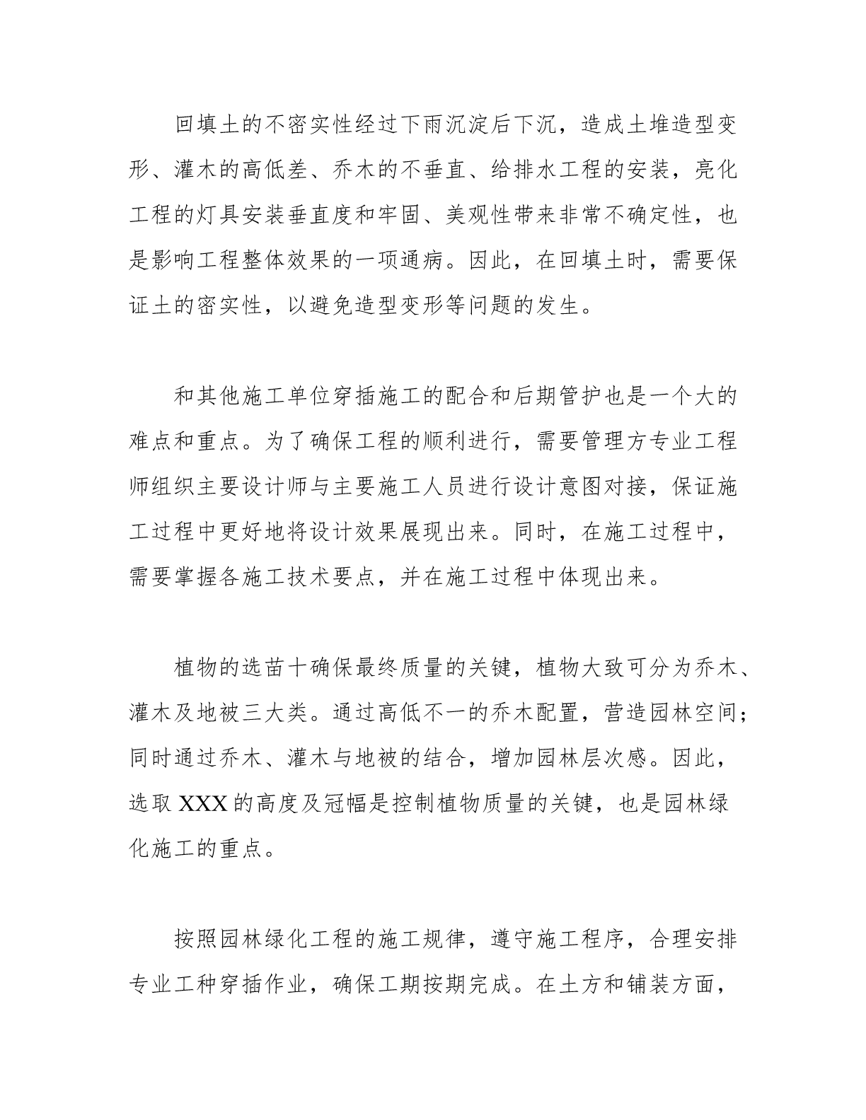 园林绿化工程的施工特点、重点和难点园林绿化工程的施工特点、重点和难点园林建设在我国仍处于发展阶段,专业人员稀缺,技术水平相对薄弱。因此,管理者应该提高自身对园林管理的认识,着重提升自身知识和能力,为我国园林建设和施工管理的现代化发展贡献一份力量。1、园林景观的施工特点1)涉及专业范围繁多。园林景观的施工涉及林业、园林、建筑、工程测量、地形测量、给排水、电气设计等多个专业领域,同时还包括假山、喷泉、雕塑和古典建筑的项目建设,与艺术类有紧密关系。2)造价管理难度较大。园林景观具有自然性,生物的成活率难以掌握,