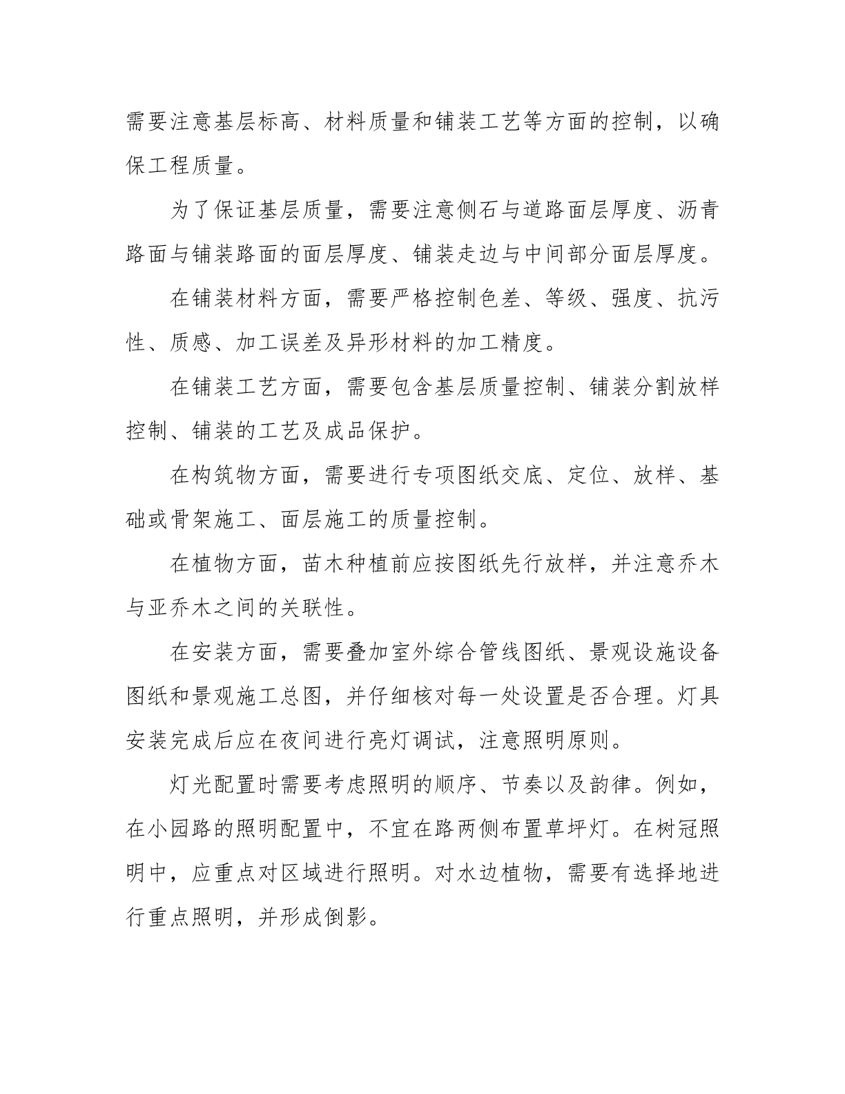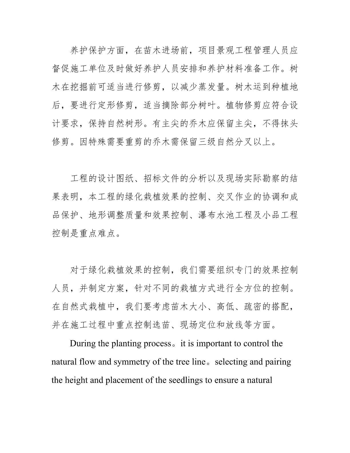 园林绿化工程的施工特点、重点和难点--园林绿化工程的施工特点、重点和难点目前我国园林建设仍处于发展状态,系统学习过园林建设的专业人员稀少,园林建设技术水准相对薄弱。管理者应该提高自身对园林管理的认识,着重提升自身知识和能力,结合当前我国园林施工管理的发展情况来提高管理能力,为我国园林建设和施工管理的现代化发展贡献一份力量。1、园林景观的施工特点(1)涉及专业范围繁多。园林景观的施工林业、园林、建筑、工程测量、地形测量、给排水、电气设计等专业,同时还包括假山、喷泉、雕塑和古典建筑的项目建设,并与艺术类有不可