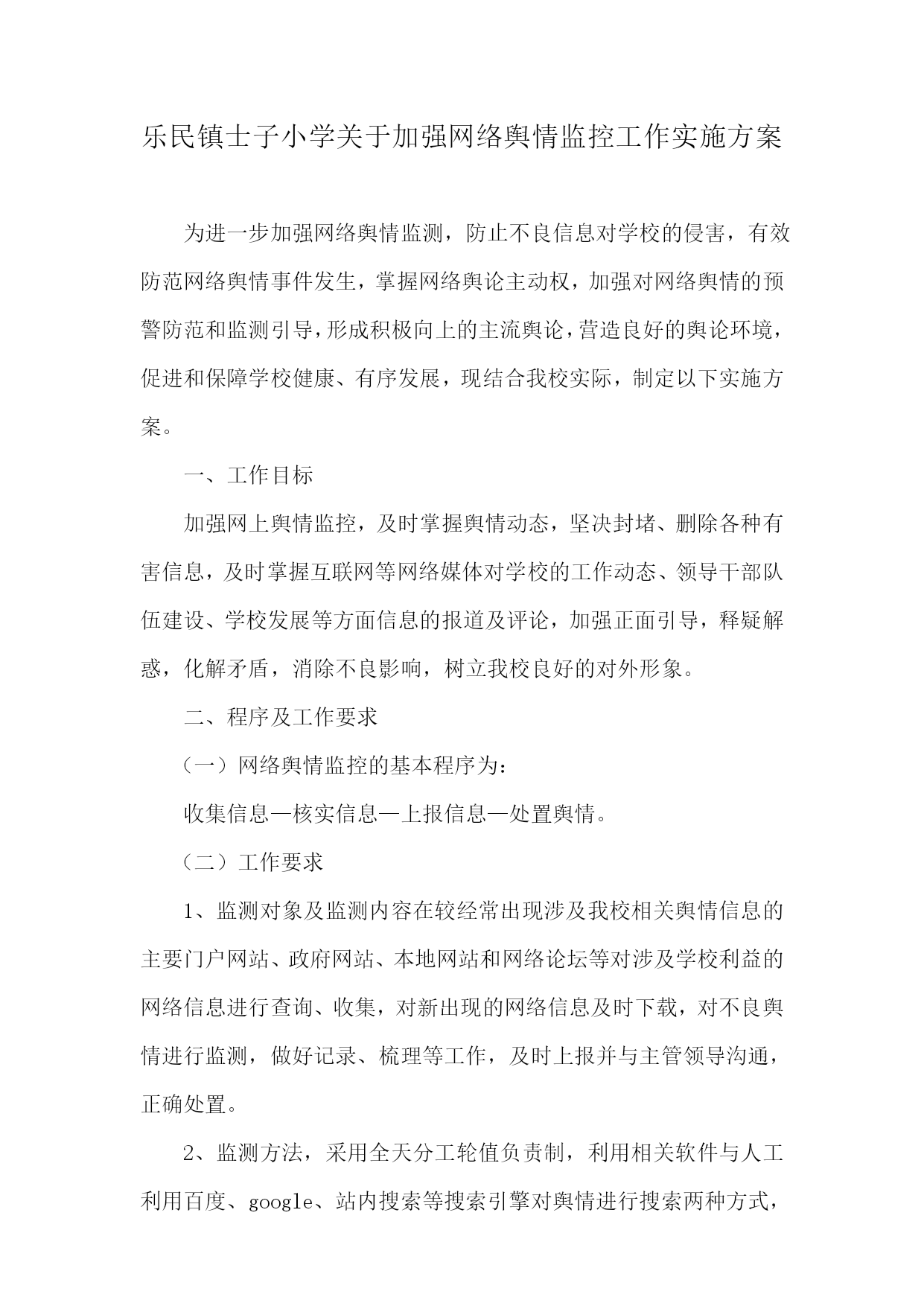 乐民镇士子小学关于加强网络舆情监控工作实施方案为进一步加强网络舆情监测,防止不良信息对学校的侵害,有效防范网络舆情事件发生,掌握网络舆论主动权,加强对网络舆情的预警防范和监测引导,形成积极向上的主流舆论,营造良好的舆论环境,促进和保障学校健康、有序发展,现结合我校实际,制定以下实施方案。一、工作目标加强网上舆情监控,及时掌握舆情动态,坚决封堵、删除各种有害信息,及时掌握互联网等网络媒体对学校的工作动态、领导干部队伍建设、学校发展等方面信息的报道及评论,加强正面引导,释疑解惑,化解矛盾,消除不良影响,树立我