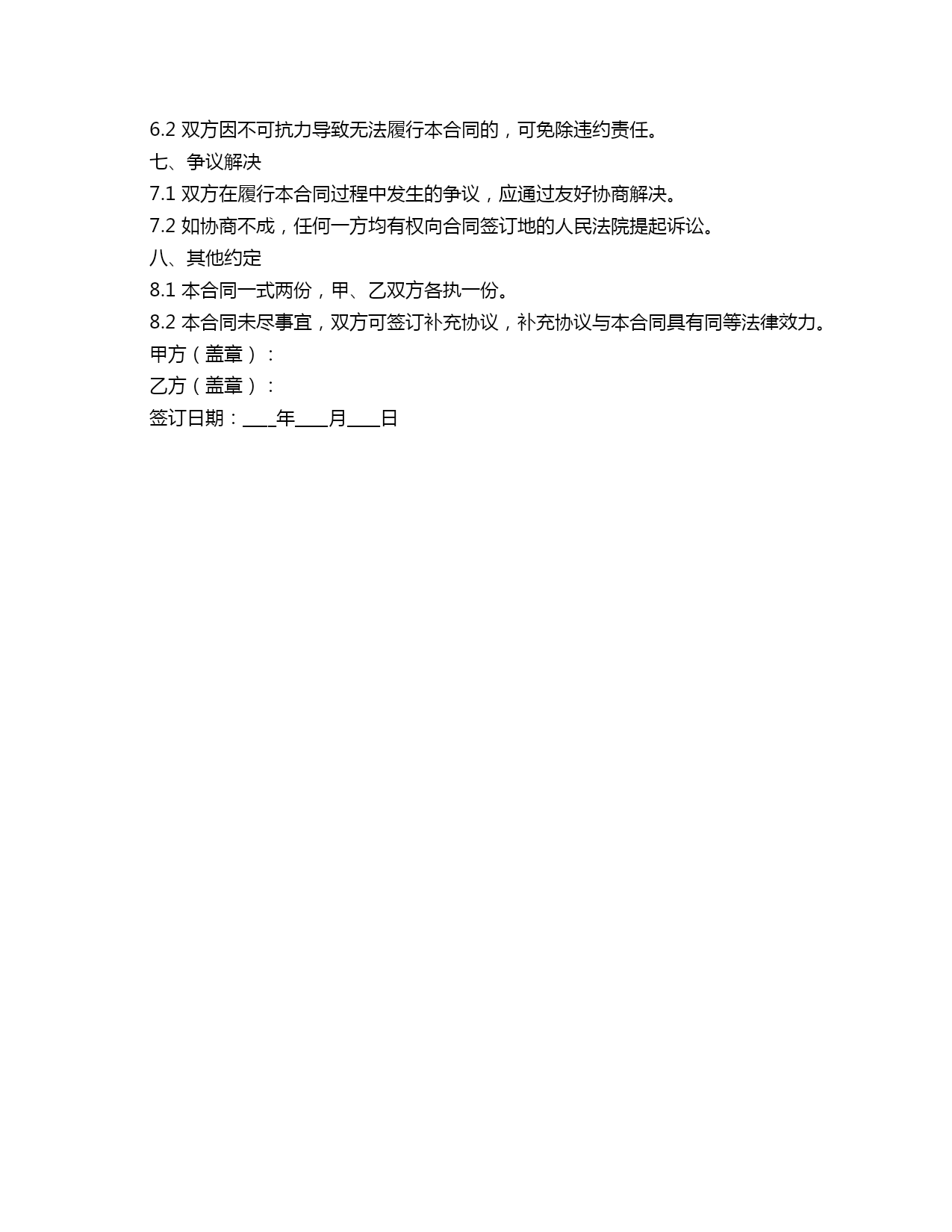 公对公合作合同范本一、合作项目1.1项目名称:__________(项目全称)1.2项目内容:双方就__________(项目内容描述)进行合作。二、合作期限2.1本合同自双方签字(或盖章)之日起生效,有效期为____年,自合同生效之日起计算。2.2如双方同意延长合作期限,应签订书面补充协议。三、合作双方的权利与义务3.1甲方的权利与义务:(1)甲方应按照本合同的约定,提供所需的资源、技术、设备等支持。(2)甲方应按照本合同的约定,支付乙方相应的合作费用。(3)甲方有权对乙方提供的服务进行监督和检查,确保