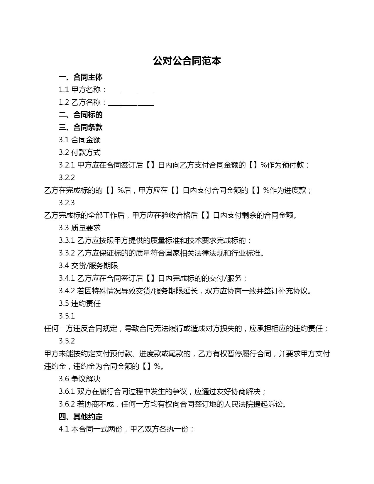 公对公合同范本一、合同主体1.1甲方名称:______________1.2乙方名称:______________二、合同标的三、合同条款3.1合同金额3.2付款方式3.2.1甲方应在合同签订后【】日内向乙方支付合同金额的【】%作为预付款;3.2.2乙方在完成标的的【】%后,甲方应在【】日内支付合同金额的【】%作为进度款;3.2.3乙方完成标的全部工作后,甲方应在验收合格后【】日内支付剩余的合同金额。3.3质量要求3.3.1乙方应按照甲方提供的质量标准和技术要求完成标的;3.3.2乙方应保证标的的质量符合