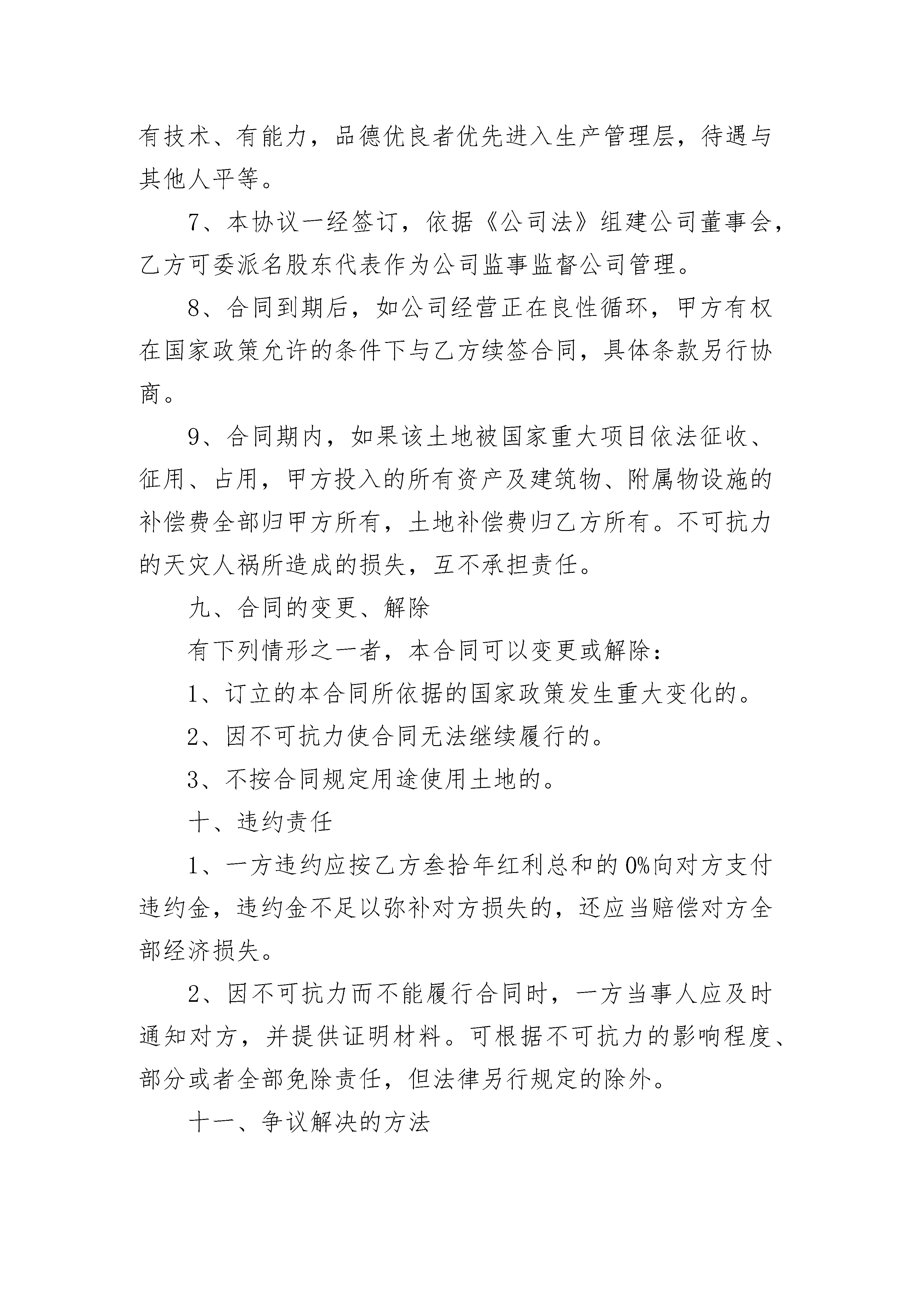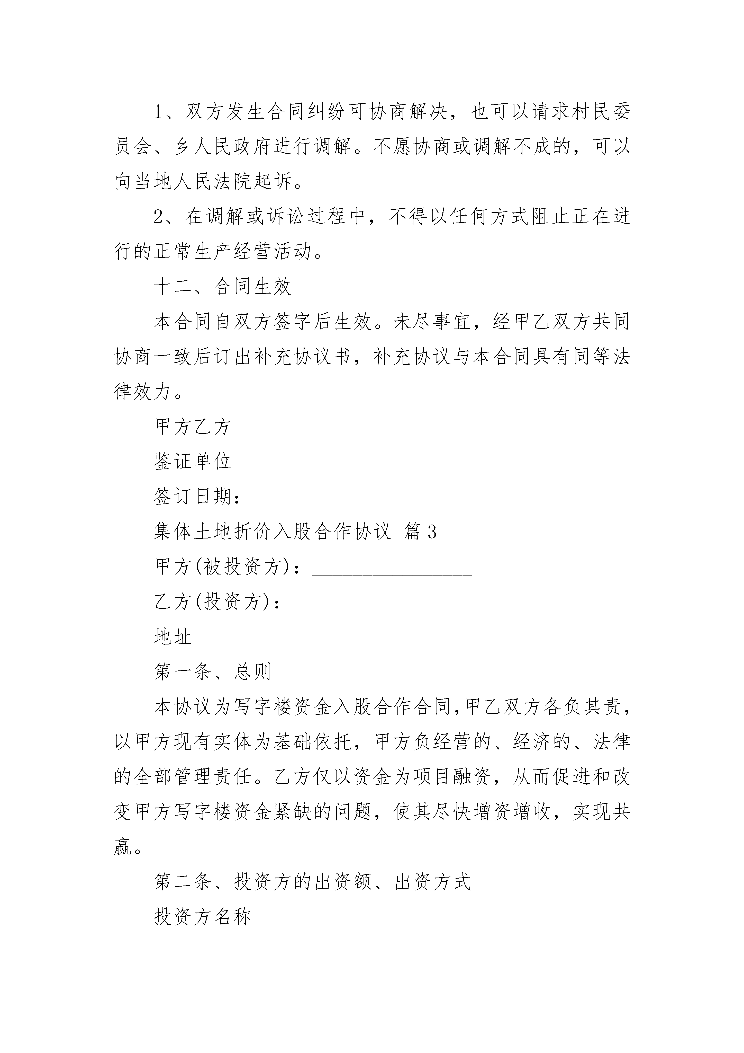 集体土地折价入股合作协议书集体土地折价入股合作协议书8篇在日常生活和工作中,很多场合都离不了协议,签订协议能够最大程度的保障自己的合法权利。那么写协议真的很难吗?以下是小编整理的集体土地折价入股合作协议书,欢迎大家分享。集体土地折价入股合作协议书1甲方:___________________法定代表人:_______________乙方:___________________法定代表人:_______________根据《中华人民共和国民法典》的有关规定,经甲乙双方友好协商,本着长期平等合作,互利互惠的原