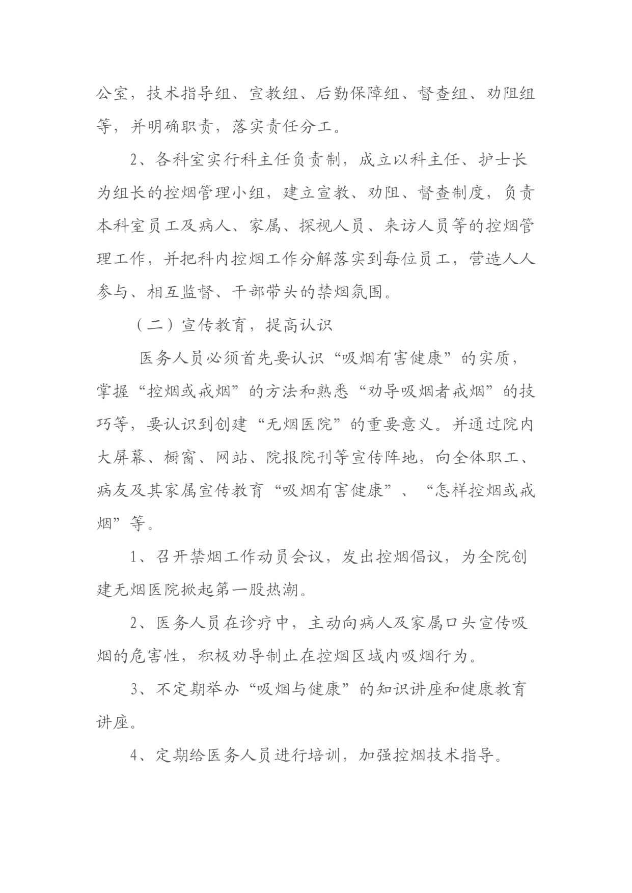 书山有路勤为径学海无涯苦作舟。医院禁烟实施方案一、工作目标通过创建无烟医院的组织实施达到卫生部《无烟医疗卫生机构标准(试行)》的基本标准实现医院室内公共场所和工作场所全面禁烟目标到2021年底通过评审建成无烟医院。二、总体要求控烟行动包括医院室内禁烟和室外限烟。室内指门诊室、诊疗室、治疗室、医技室、住院部、办公室、会议室、活动室等室内范围。室内区域全面实行禁烟任何人(含医院工作人员和院外人员)都不得在室内吸烟(吸烟区除外)。