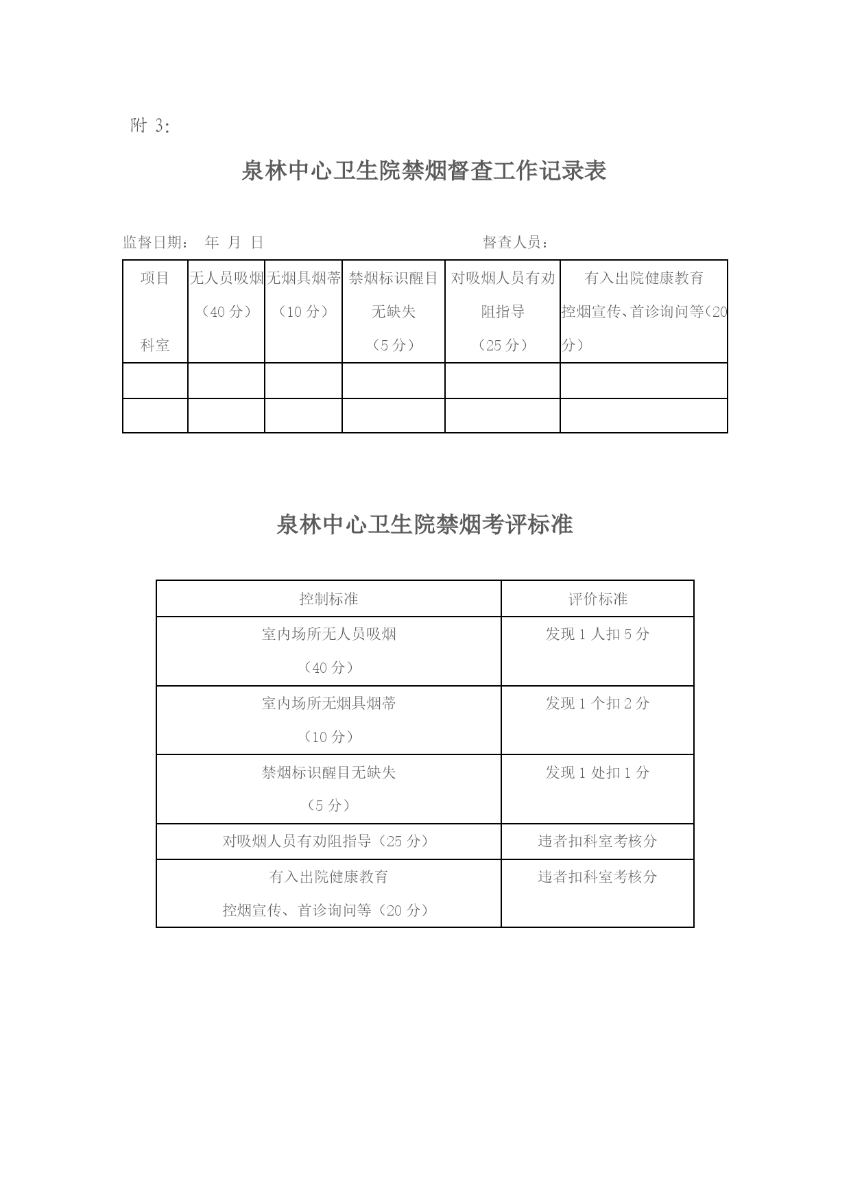 泗水县泉林中心卫生院禁烟实施方案一、指导思想为深入贯彻落实济宁市卫生局《济宁市医疗卫生系统全面禁烟工作实施方案》、泗水县卫生局《泗水县医疗卫生系统全面禁烟工作实施方案》,我院大力开展禁烟活动,并积极宣传吸烟的危害性,提高职工对控烟的认识,营造健康和谐医院环境,确保控烟工作得到落实。二、工作目标(一)建立比较完善的禁烟工作组织领导系统和督导评估体系,确保医院工作场所和室内公共场所全面禁烟。(二)建立健全控烟工作网络,加强专业队伍技术指导,积极开展控烟宣传和倡导活动,提高控烟能力和戒烟服务能力。(三)从201