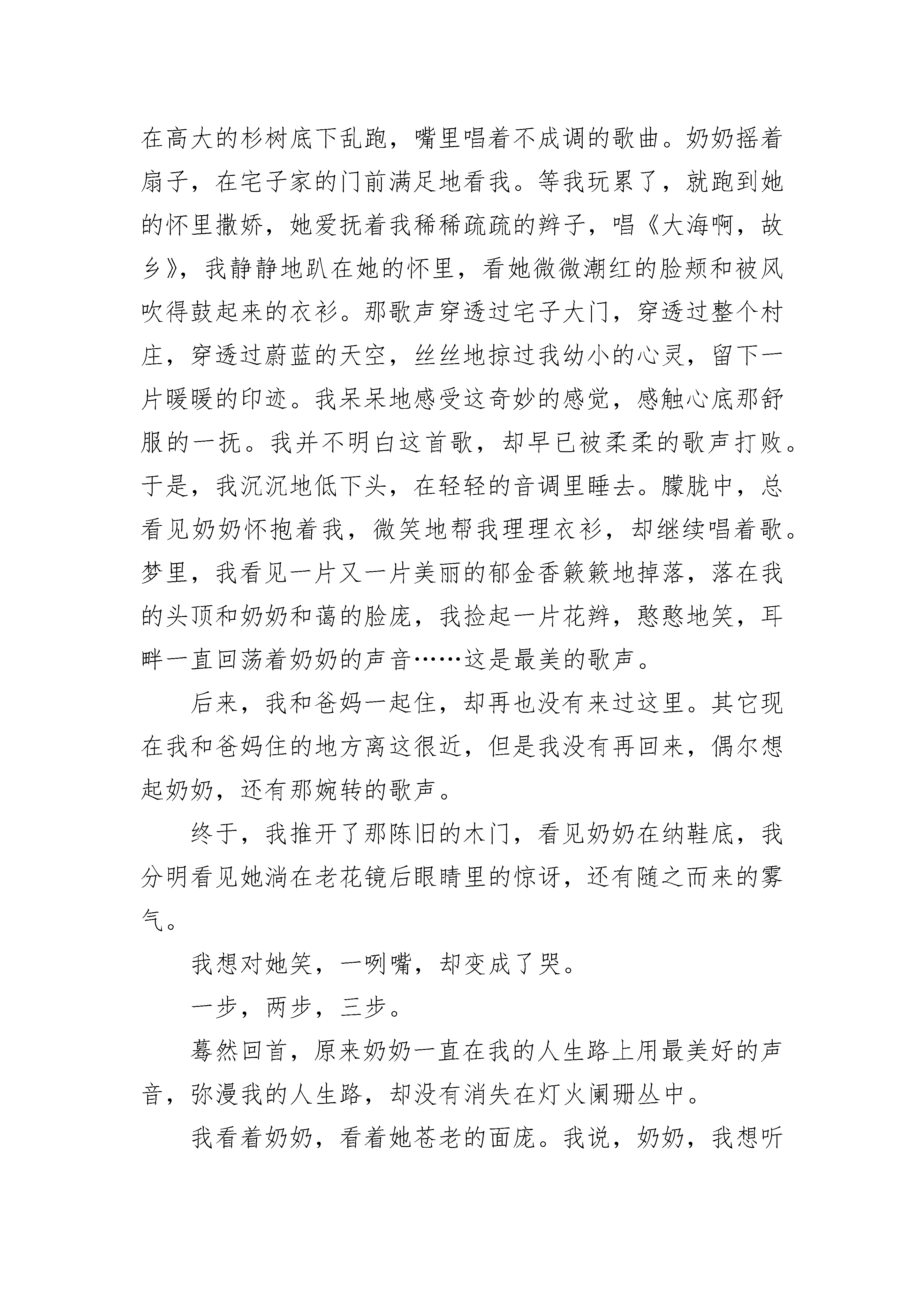 我心底的好声音初二作文我心底的好声音初二作文雪下了又融,草黄了又绿,任凭世事变更,时间远去,我都会守在你的身边,陪你看日出日落,门前花开。——题记阳光微斜,风吹得花伞呼呼作响,阳光下,地上的水坑反射着柔和的光芒。转头看向右方,对上那温柔的目光,伸出手,触摸那温暖的面庞,望着天,又想起那幸福的过往……你的声音总是那么婉转动听。儿时,总是缠着你给我讲故事,你从不厌烦,一遍又一遍地重复那单调的情节。小学时,你总是耐心地给我读课文,陪我背演讲稿,即便是我不高兴,你也能用那温和的声音去安慰我、鼓励我。你的声音又是那