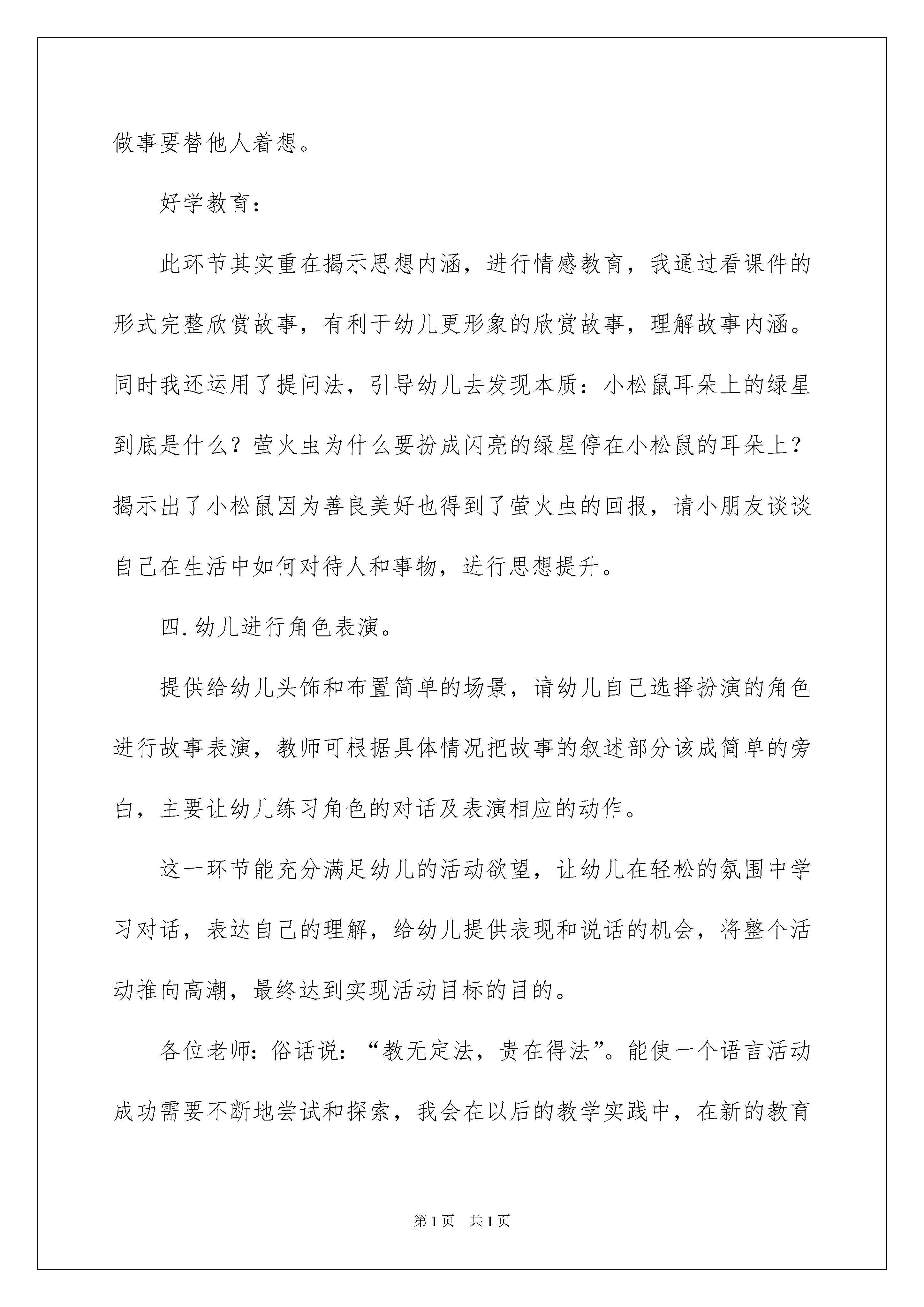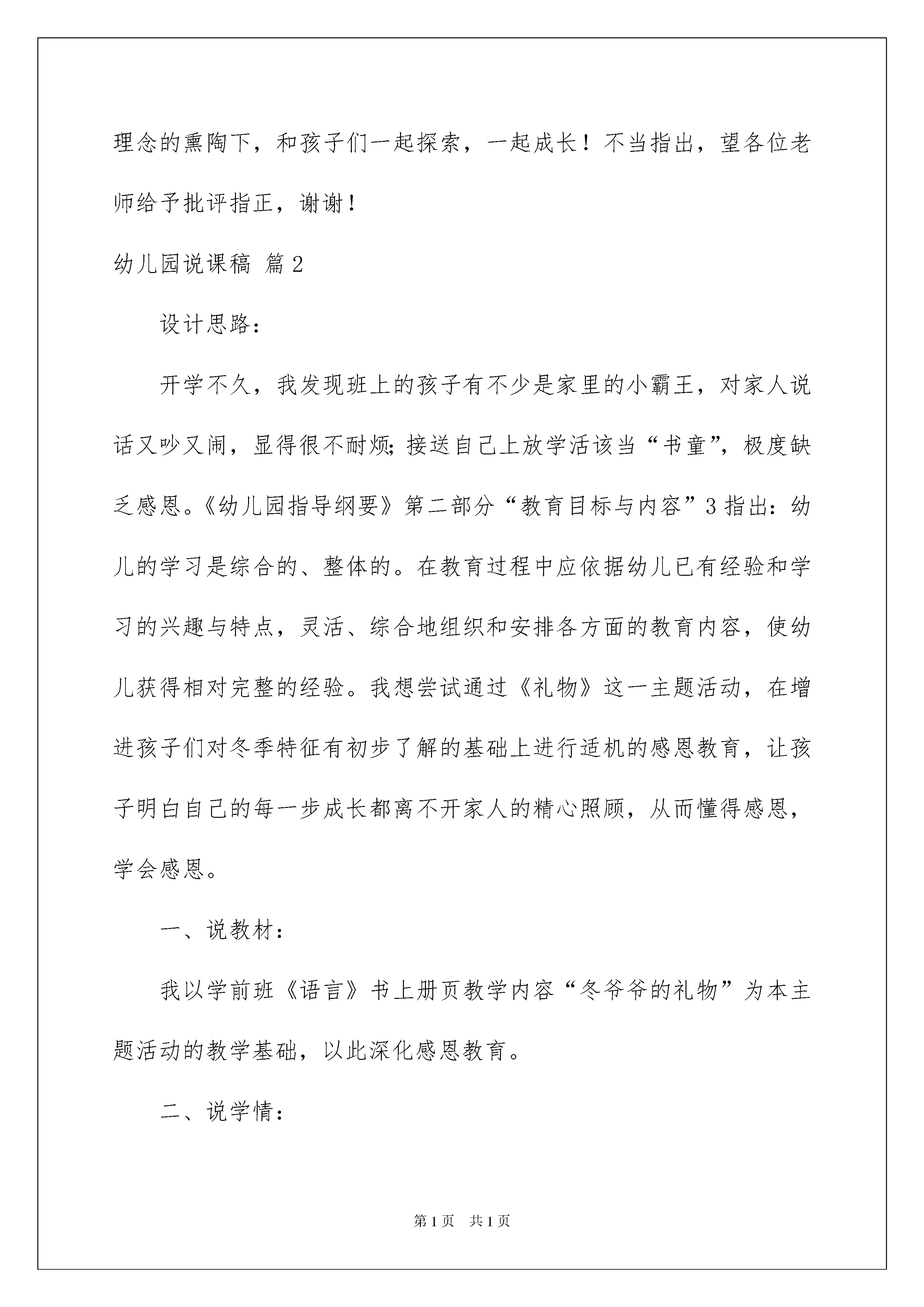 2022幼儿园说课稿模板合集9篇幼儿园说课稿模板合集9篇在教学工作者开展教学活动前,常常要根据教学需要编写说课稿,借助说课稿可以有效提升自己的教学能力。快来参考说课稿是怎么写的吧!下面是我为大家收集的幼儿园说课稿9篇,仅供参考,欢迎大家阅读。幼儿园说课稿篇1一、说教材。(一)说设计意图:《耳朵上的绿星》这一内容情节有趣,形象鲜明突出,语言诙谐有趣,容易引起幼儿的学习兴趣,又可以扩展孩子的词汇量;其二是现在的孩子由于受生活环境限制,缺乏与周围人相处的经验,普遍存在对周围事物缺乏感情的行为,所以这一内容既符合幼儿年龄特点,又符合孩子的现实需要。(二)说活动目标:《幼儿园教育指导纲要》在语言领域中提出:“发展幼儿语言的关键是创设一个能使他们想说、敢说、喜欢说、有机会说并能得到积极应答的环境”以及要“鼓励幼儿大胆、清楚地表达自己的想法和感受,发展幼儿语言表达能力和思维能力。”根据这一目标和要求,结合中班幼儿年龄特点和语言发展水平,因此,我从能力和情感两方面提出了本次活动的目标:1、从能力上,理解故事的情节、内容,感受作品中小松鼠善良,美好的角色形象;大胆、清楚表达自己的想法和感受,乐意参与表演,大胆学说角色对话。2、从情感上,使幼儿懂得,做事要多为他人着想,要互相关心,互相帮助。(三)说活动重、难点:本次活动的教学重点是理解故事情节、内容,使幼儿懂得做事要替别人着想,教学难点是请幼儿大胆、清楚表达自己的想法和感受,乐意参与表演,大胆学说角色对话。二、说活动准备。为了更好地服务于本次的活动目标,完成活动内容,我作了以下准备:小松鼠等角色教具,教学图片一套,故事课件一套,表演用头饰若干个。三、说教法。教育心理学认为“学习者同时开放多个感知通道,比只开放一个感知通道,能更准确有效地掌握学习对象。”根据幼儿的学习情况,本次活动我运用了直观法、提问法、角色游戏等教学方法。为什么要采用以上方法呢?采用直观法是因为这个年龄段的幼儿思维具有明显的具体形象性特点,属于典型的具体形象性思维。从幼儿认识事物的特点和语言本身特点来看,在幼儿园语言教育中贯彻直观性原则非常重要。以看图片、看课件的形式直接刺激幼儿的视听器官,能使教学进行得生动活泼,激发幼儿学习的兴趣。好学教育:采用提问法是因为提问能引导幼儿有目的地、仔细地观察,启发幼儿积极思维。我运用启发性提问让幼儿将看到的具体形象的图片或课件用语言描述出来,是解决活动重点的有效方法。采用角色游戏法是因为角色游戏是幼儿最喜爱的活动,在幼儿身心略感疲惫时,游戏能增强幼儿参与活动的兴趣。幼儿在进行角色表演中能充分地表现自我,大胆说话。四、说学法。遵循幼儿学习的规律和幼儿的年龄特点,在《纲要》新理念的指导下,整个学习活动,始终以幼儿为主体,变过去的“要我学”为现在的“我要学”。遵循由浅入深的教学原则,幼儿在看看、听听、想想、说说、玩玩的轻松气氛中掌握活动的重、难点。幼儿将运用观察法、讨论谈话法等。观察法是幼儿通过视、听觉感官积极参与活动,幼儿通过观看情境表演直接获得印象。讨论谈话法是幼儿在讨论、谈话中无拘无束地说出自己的理解与看法,是幼儿练习说话的好机会。五、说活动过程。结合幼儿园教育工作原则和本次活动的目标,我设计了以下四个环节:1、出示主要角色,引起幼儿兴趣,引出课题。2、结合图片,分段欣赏故事,理解故事内容。3、看课件,完整欣赏故事,感受小松鼠的善良美好,使幼儿懂得做事要替他人着想。4、幼儿进行角色表演。一.出示小松鼠,引起幼儿兴趣,引出课题。兴趣是幼儿主动参与活动的关键,开始部分我就以一个孩子们喜欢的角色吸引了他们的眼球,并且通过一个提问直接进入了课题:今天晚上,小松鼠要上台表演唱歌,请小朋友帮它出出主意,怎样才能打扮得很美呢?(请幼儿讨论并说说)二.结合图片,分段欣赏故事,理解故事内容。此环节我运用了直观法和提问等方法,把故事进行分段讲述。1、到“小松鼠不摘草,也不采花,他真好。”通过提问:a、小松鼠为什么要把自己打扮得很美?b、小松鼠到了哪里,看到了什么,他怎么想?c它为什么不用花草打扮自己?d、这件事别谁看到了,它们怎么说?让幼儿理解故事情节。2、到“小松鼠从来没有这么漂亮过。”提问:a、小松鼠怎么会这么漂亮?b、小松鼠耳朵上闪亮的绿星是什么?是从哪儿来的?3、到结束,提问:小松鼠上台表演了,为什么台下的观众都惊呆了?三.看课件,完整欣赏故事,感受小松鼠的善良美好,使幼儿懂得做事要替他人着想。好学教育:此环节其实重在揭示思想内涵,进行情感教育,我通过看课件的形式完整欣赏故事,有利于幼儿更形象的欣赏故事,理解故事内涵。同时我还运用了提问法,引导幼儿去