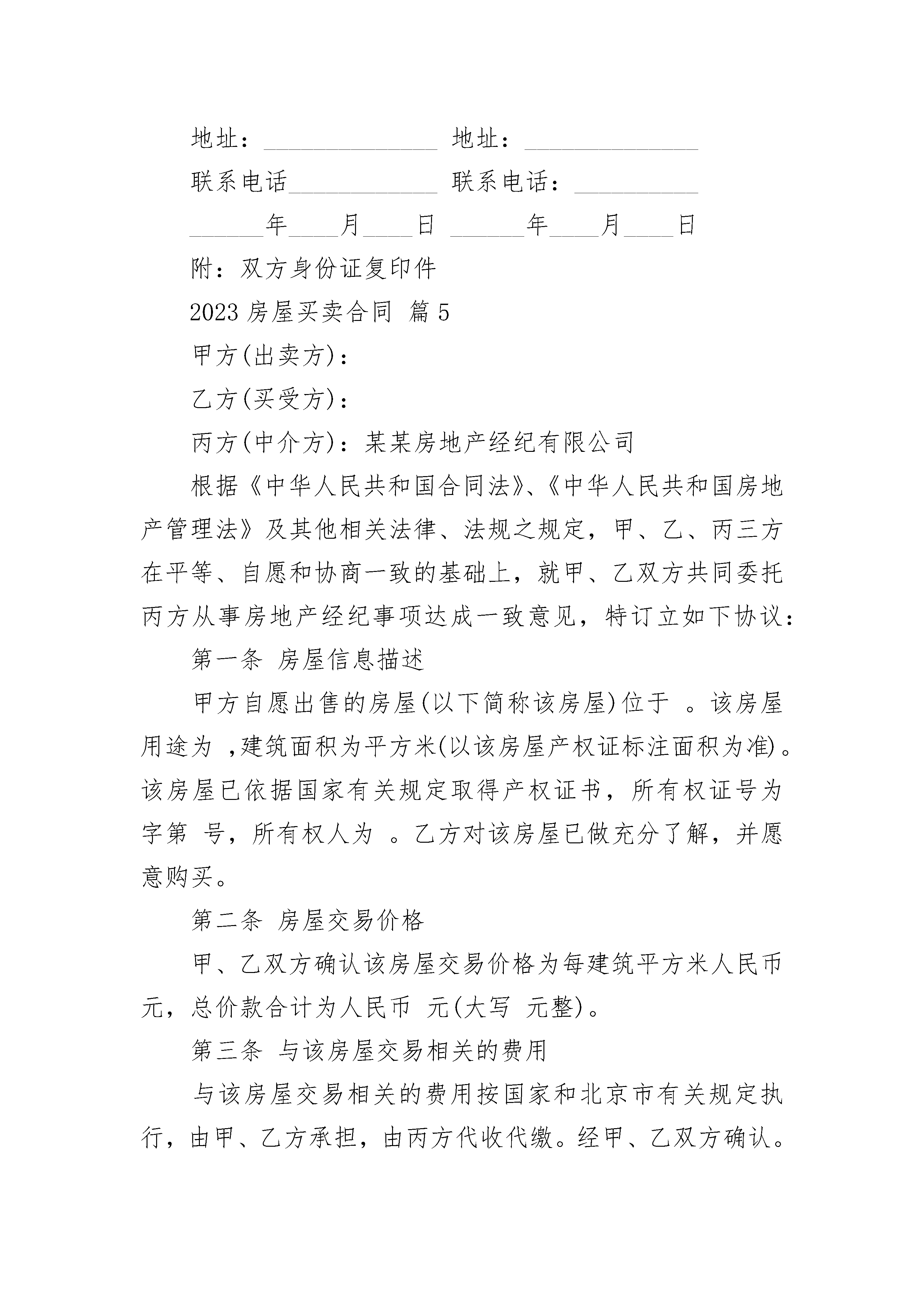 房屋买卖合同2023房屋买卖合同2023篇1甲方(出卖方):___________身份证号码:_____________________乙方(购买方):___________身份证号码:_____________________甲、乙双方就房屋买卖事项在平等自愿,协商一致前提下订立本合同条款如下,以资共同遵守。第一条甲方将自愿将坐_____________________________________的房地产﹝房屋建筑面积________平方米﹞出售给乙方。乙方以对甲方所要出售的房地产做了充分的了解,愿