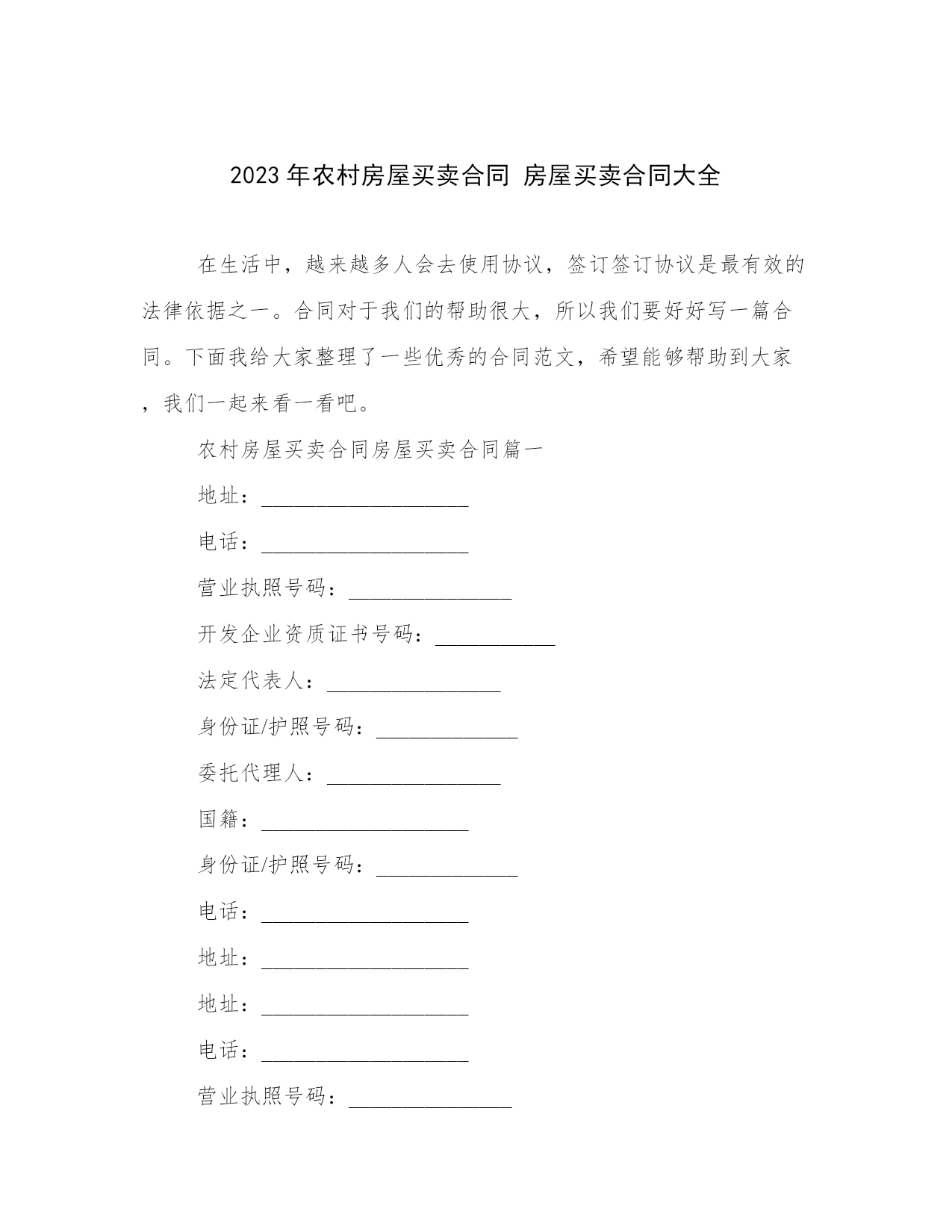 2023年农村房屋买卖合同房屋买卖合同大全在生活中,越来越多人会去使用协议,签订签订协议是最有效的法律依据之一。合同对于我们的帮助很大,所以我们要好好写一篇合同。下面我给大家整理了一些优秀的合同范文,希望能够帮助到大家,我们一起来看一看吧。农村房屋买卖合同房屋买卖合同篇一地址:___________________电话:___________________营业执照号码:_______________开发企业资质证书号码:___________法定代表人:________________身份证/护照号码: