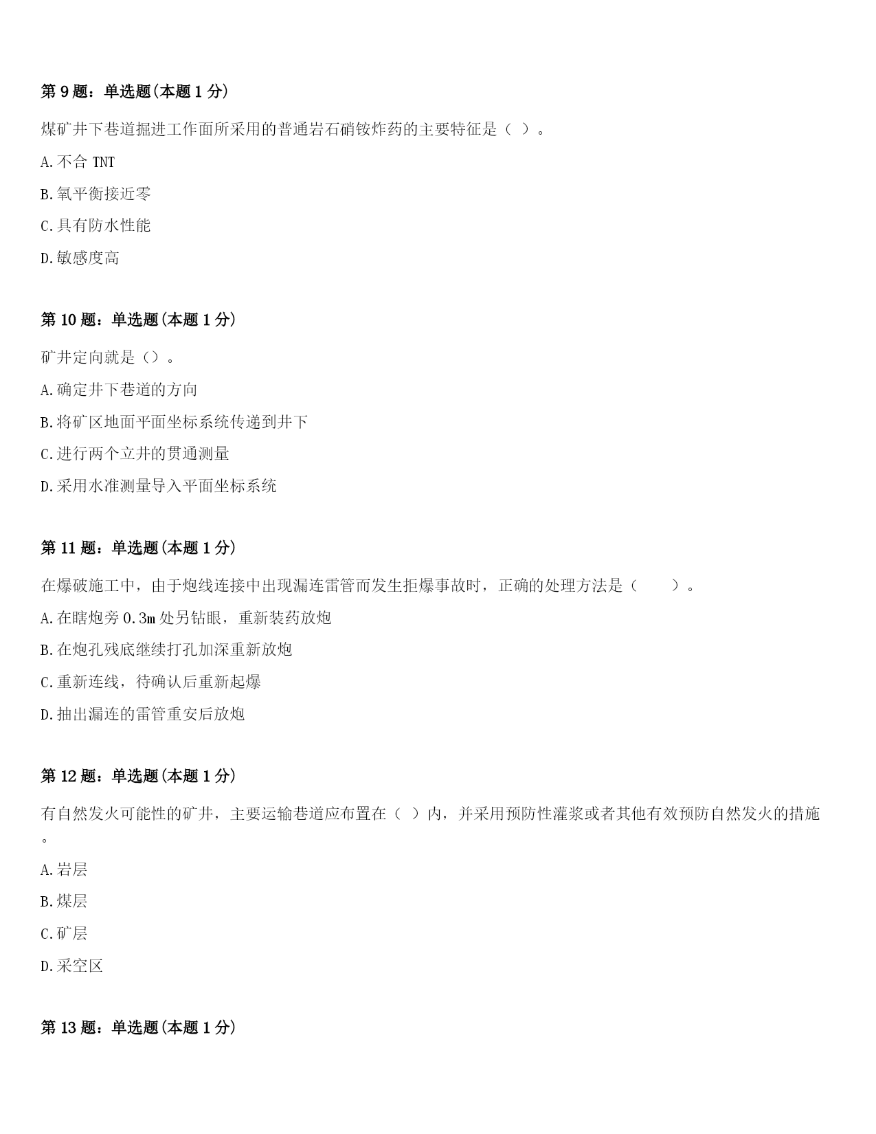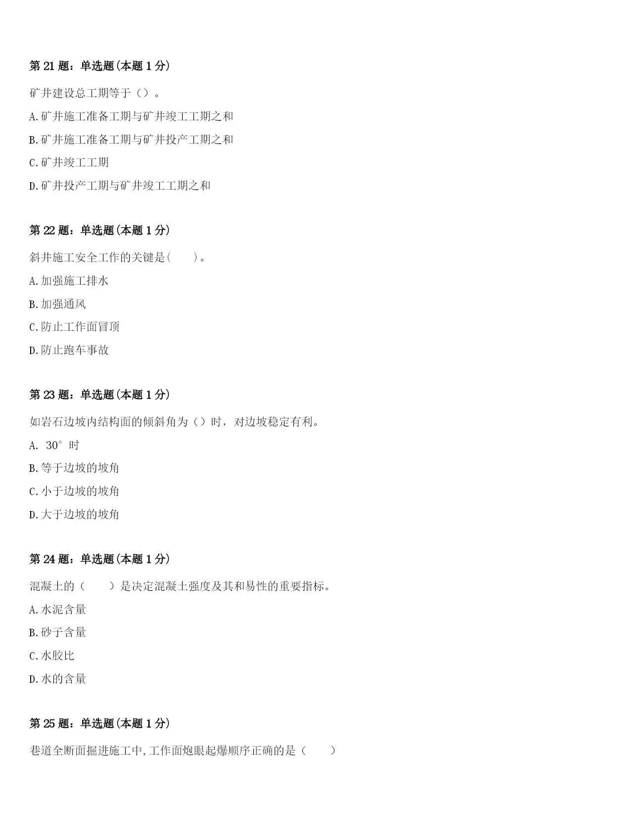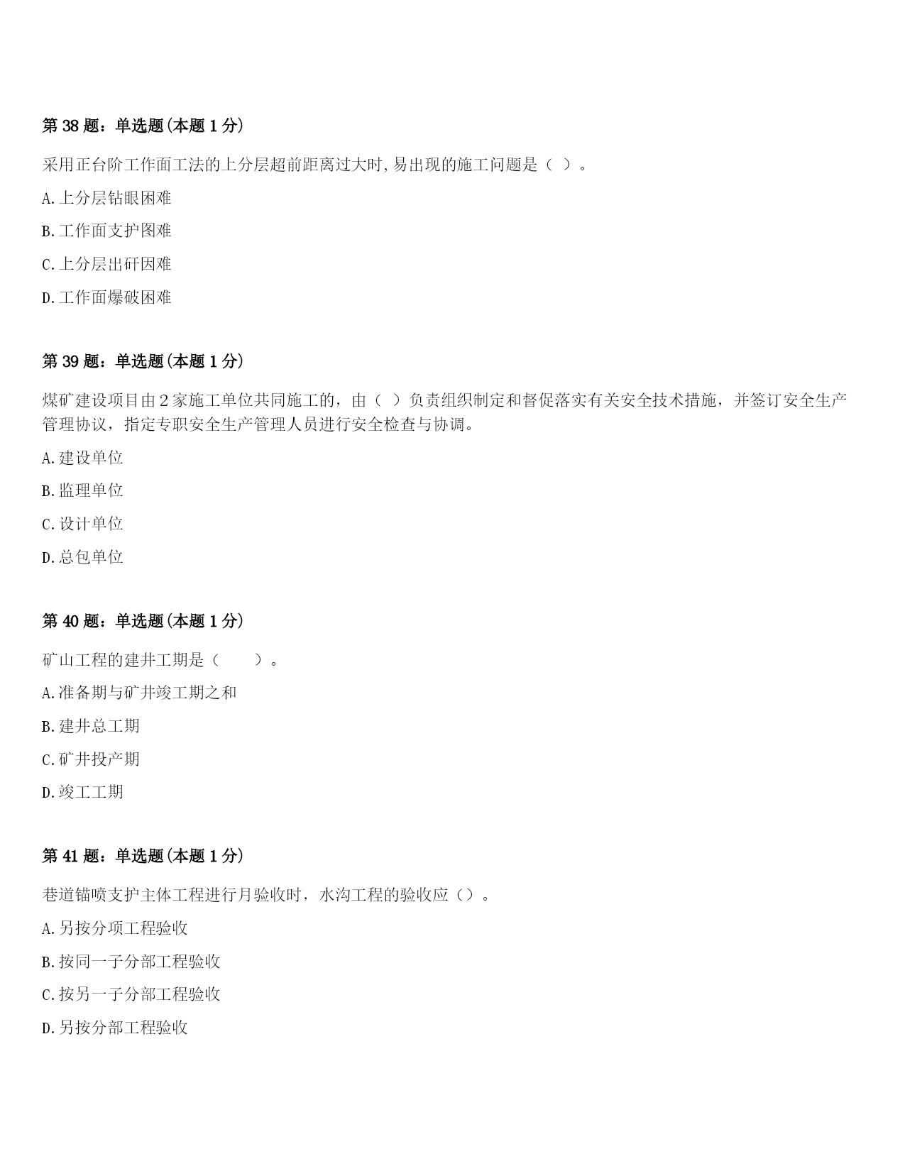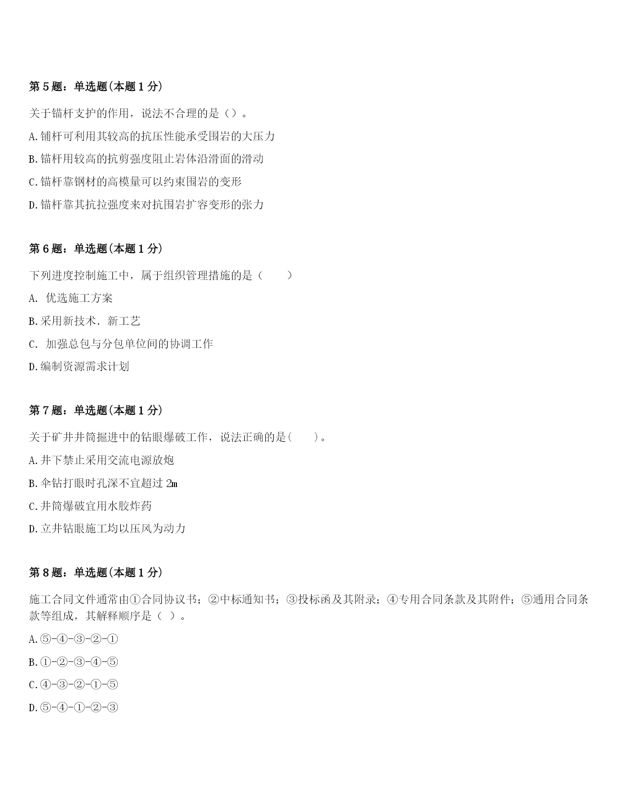 2024年哈尔滨市呼兰区二级建造师考试《矿业工程管理与实务》考前冲刺试题及答案第1题:单选题(本题1分)不能有效提高软岩巷道支护强度与效果的措施是()。A.喷射混凝土支护B.联合支护C.增设底脚锚杆D.封底支护第2题:单选题(本题1分)缓坡斜井采用台阶法进行全断面一次施工时,最大的特点是()。A.增大了爆破自由面B.提高了打孔质量C.缩小了断面的高度D.缓解了钻孔、出矸和支护的矛盾第3题:单选题(本题1分)建筑工程质量控制要全面控制施工过程,施工阶段质量管理的关键是加强对()的质量控制。A.工序B.分项工