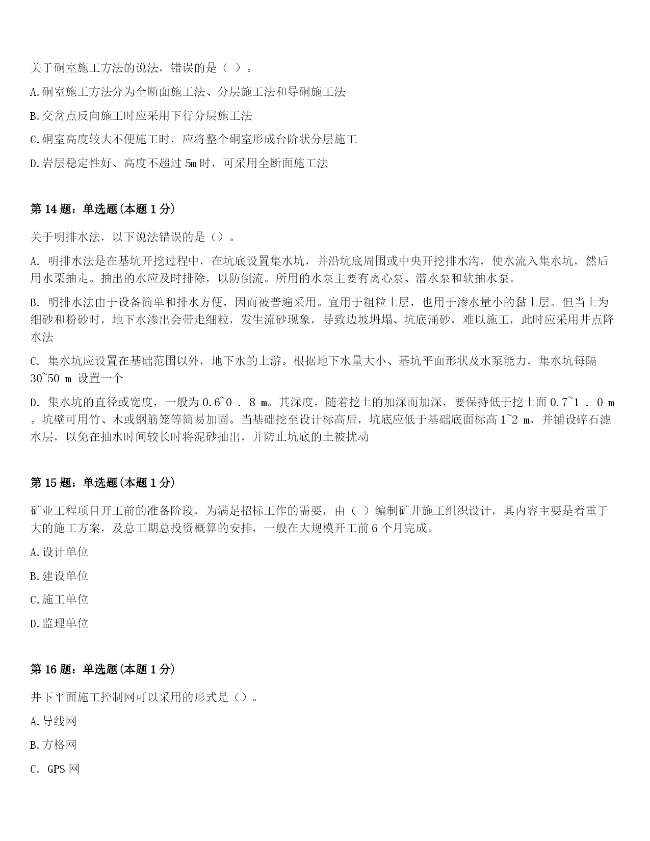 2024年哈尔滨市呼兰区二级建造师考试《矿业工程管理与实务》考前冲刺试题(附答案及解析)第1题:单选题(本题1分)由于矿业工程地下施工条件的复杂性和当前认识水平的有限,使地下施工技术参数具有不确定性,由此引起的施工索赔属于()的因素。A.工程技术方面B.工程内容方面C.工程规模方面D.工程环境方面第2题:单选题(本题1分)关于巷道施工采用混合式通风方式的正确说法是()。A.混合式通风可有效保证巷道内风流主要为新鲜风流B.工作面只要布置1台风机即可实现混合式通风工作C.通风设备风筒可以选用柔性风筒,轻便、经