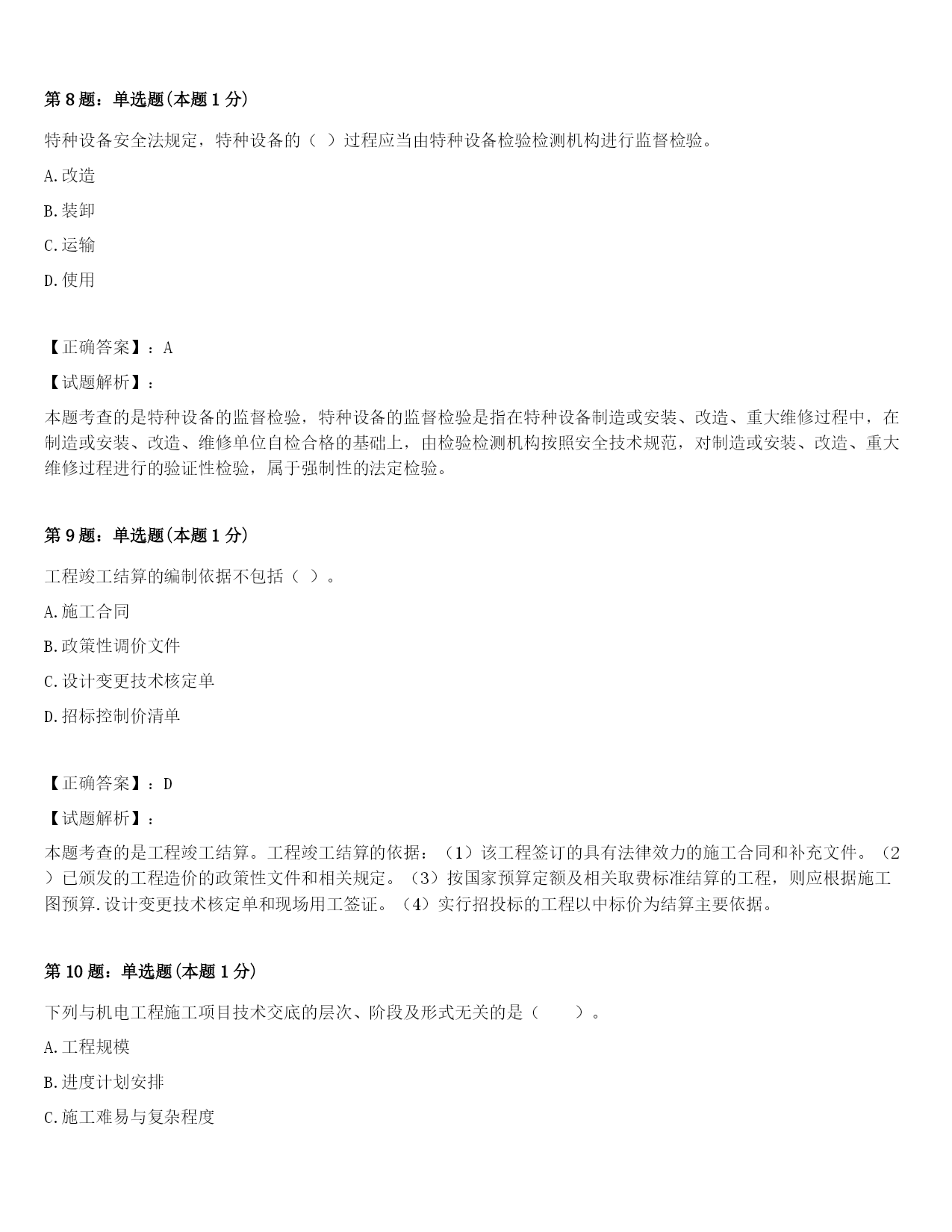2024年咸宁市嘉鱼县二级建造师考试《机电工程管理与实务》押题密卷(附答案及解析)第1题:单选题(本题1分)通气管应高出屋面(),且必须大于最大积雪厚度。A.500mmB.300mmC.200mmD.1000mm【正确答案】:B【试题解析】:2023教材P138/2022教材P137通气管应高出屋面300mm,且必须大于最大积雪厚度。第2题:单选题(本题1分)有关基准线测量原理说法,不正确的是()。A.基准线测量原理是利用经纬仪和检定钢尺,根据两点成一直线原理测定基准线B.只要定出两个基准中心点,就构成一