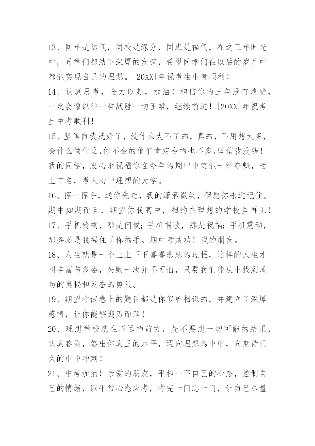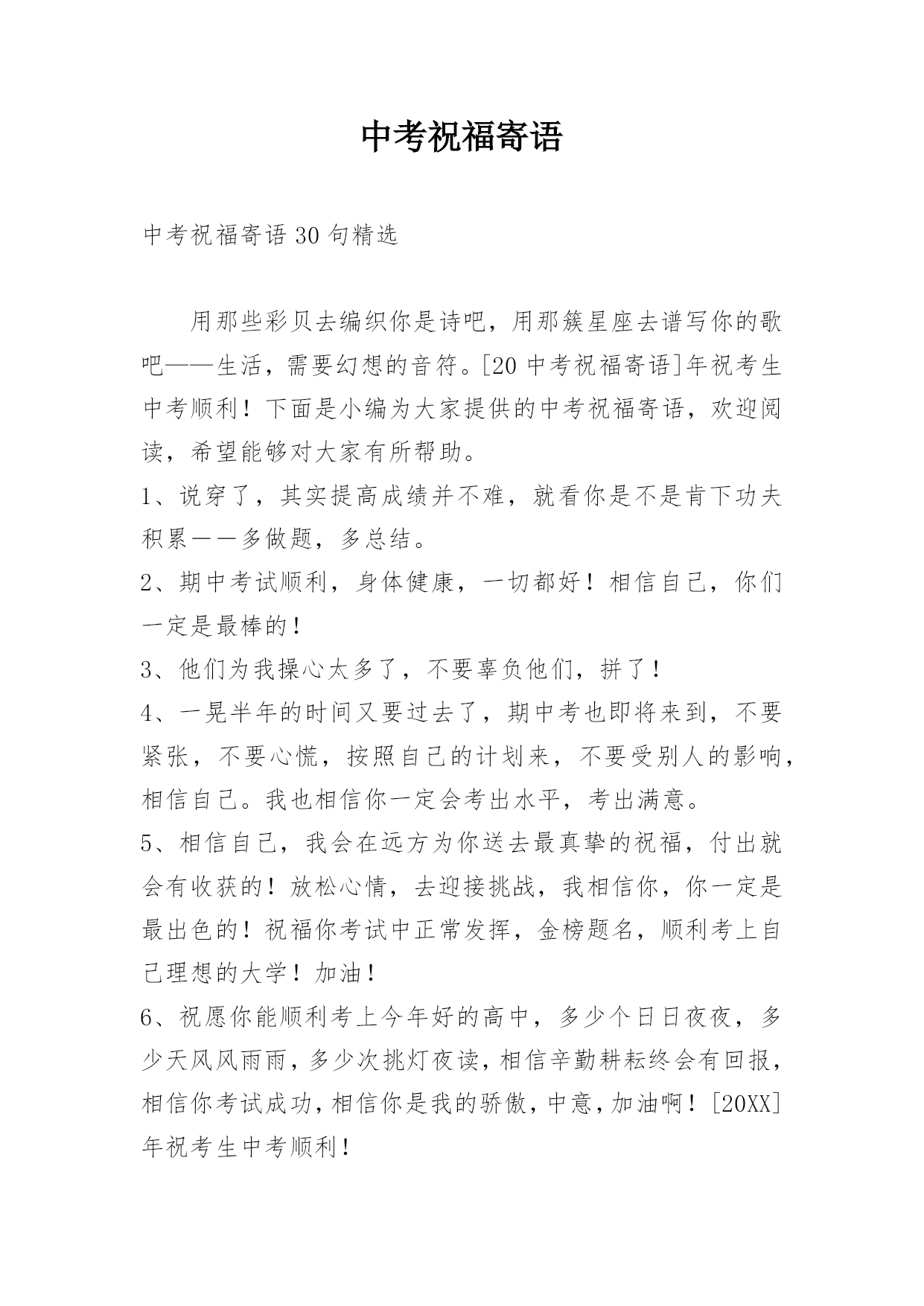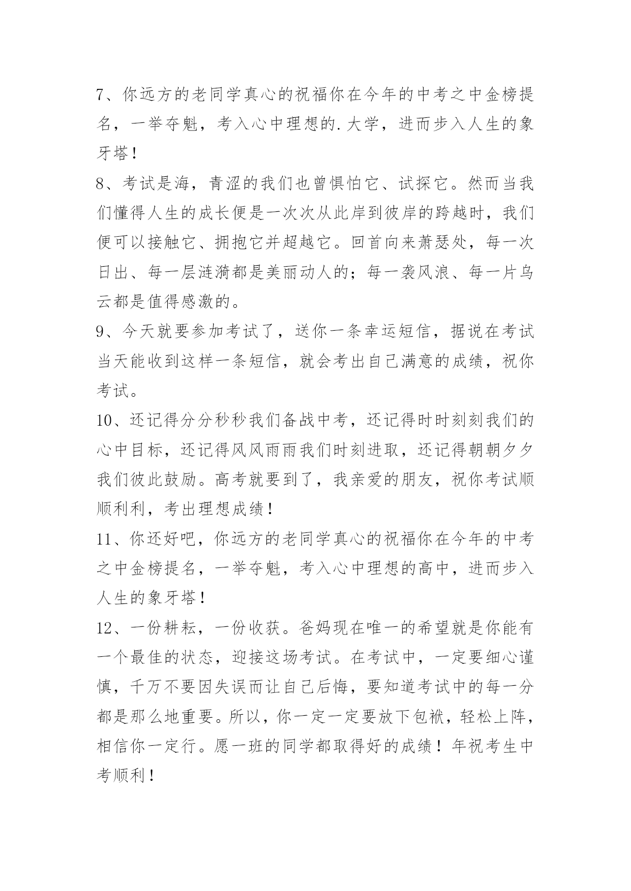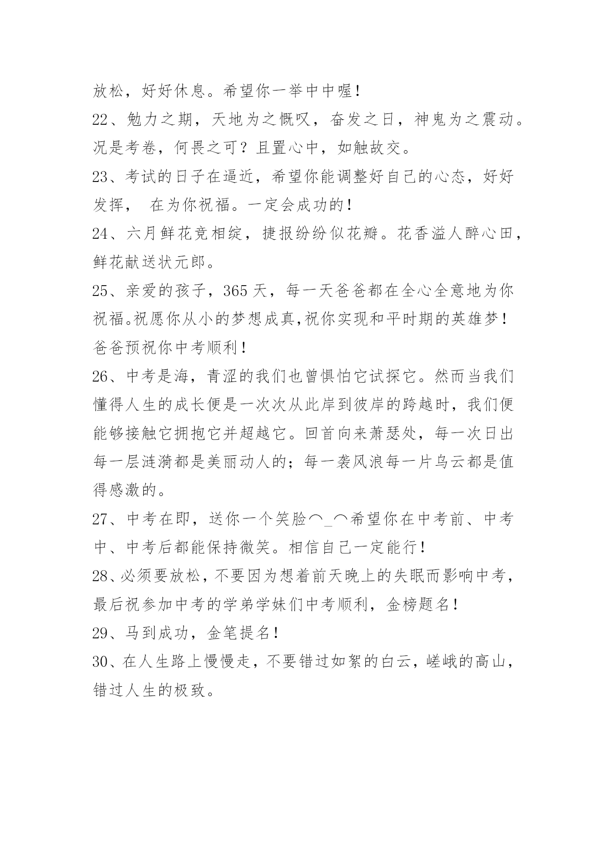 中考祝福寄语中考祝福寄语30句精选用那些彩贝去编织你是诗吧,用那簇星座去谱写你的歌吧——生活,需要幻想的音符。[20中考祝福寄语]年祝考生中考顺利!下面是小编为大家提供的中考祝福寄语,欢迎阅读,希望能够对大家有所帮助。1、说穿了,其实提高成绩并不难,就看你是不是肯下功夫积累――多做题,多总结。2、期中考试顺利,身体健康,一切都好!相信自己,你们一定是最棒的!3、他们为我操心太多了,不要辜负他们,拼了!4、一晃半年的时间又要过去了,期中考也即将来到,不要紧张,不要心慌,按照自己的计划来,不要受别人的影响,相