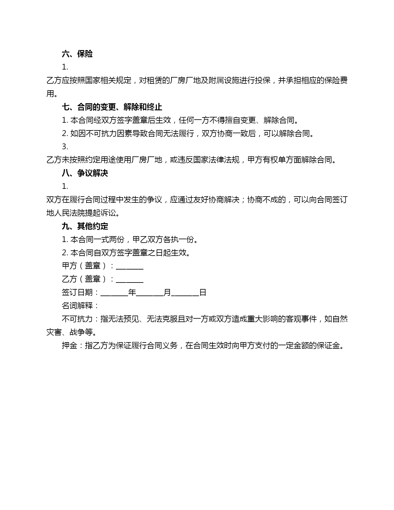 厂房厂地出租合同范本甲方(出租方):________乙方(承租方):________一、出租物的基本情况1.厂房厂地位置:________(具体地址)2.厂房厂地面积:________平方米3.厂房厂地结构:________(详细描述厂房厂地的结构)4.厂房厂地用途:________(明确乙方租赁用途)名词解释:厂房:指用于生产、加工、储存等用途的建筑设施。厂地:指用于工业生产、仓储等用途的土地。二、租赁期限1.租赁期限:自________年________月________日起至________年___