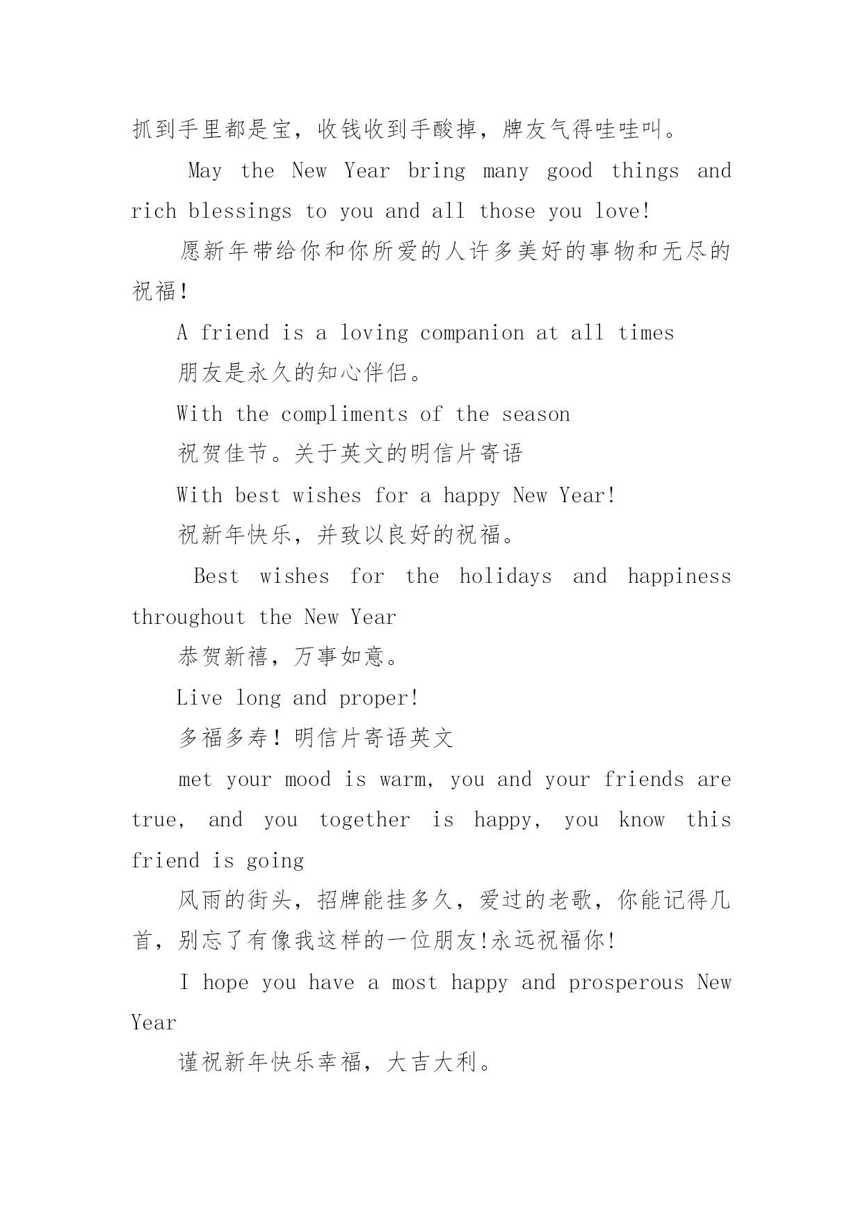 明信片寄语英文_英文的明信片寄语明信片寄语英文_关于英文的明信片寄语在日常学习、工作或生活中,大家都不可避免地要接触到寄语吧,寄语是自己希望能达到的或是祝福的话语。那什么样的寄语才是好的寄语呢?下面是小编精心整理的明信片寄语英文_关于英文的明信片寄语,希望对大家有所帮助。windistransparent,therainisticking,thecloudisflowing,thesongisfree,loveistheheart,loveiscrazy,itiseternity,youareunforg
