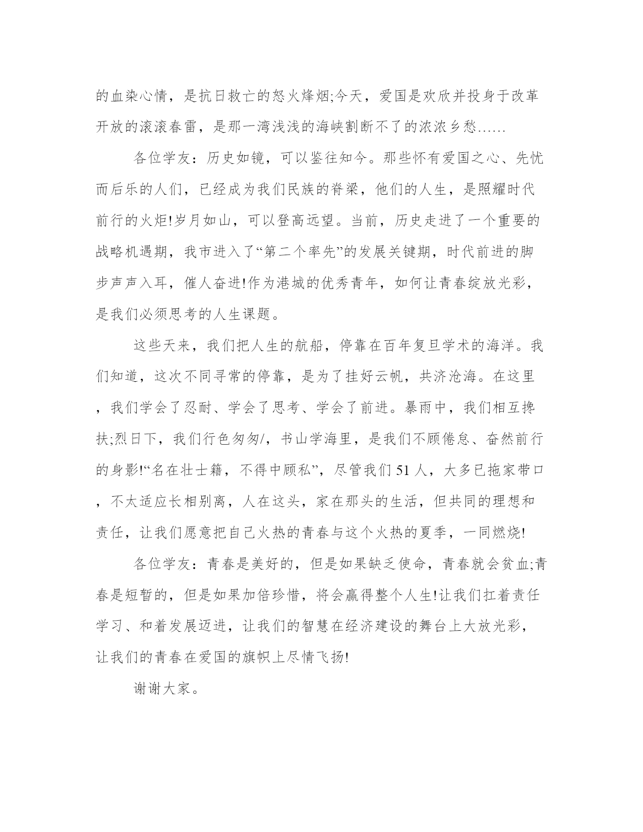 让青春在爱国的旗帜上飞扬各位学友:我演讲的题目是让青春在爱国的旗帜上飞扬。85年前,一批有为的青年,在南湖的游船上,用爱国的火炬,照亮了旧中国的暗夜,照亮了新中国的前程,也照亮了自己的青春。85年来,无数青年志士,高举爱国的旗帜,外御强权,内求解放,捐身国难,视死如归,用鲜血和生命,铸就了永不退色的青春。今天,我们幸逢盛世,亿万青年所面对的,不再是淋漓的鲜血,不再是惨淡的人生。然而有的青年却感到迷惘,他们甚至这样感叹:乱世出英雄,如果生在那个时代,我一定会大干一场……而现在,英雄无用武之地,我该干些什么呢
