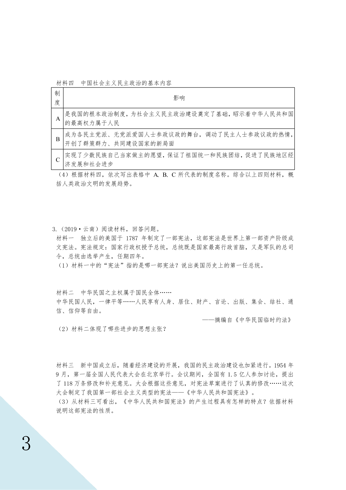 专题九中外民主与法制建设刻意练习·提能力1.(2019·泰安)民主与法制建设是古今中外人类社会建设的重要组成部分,也是衡量社会发展程度的重要标尺。阅读材料,回答问题。材料一公元前450年左右,罗马通过了一部法律文献,涉及诉讼程序、所有权和债务权、宗教法等内容。其中的债务法规定:债权人有权拘禁不能按期还债的债务人。甚至可以给他戴上脚镣,卖到国外或杀死他……使量刑定罪有了文字依据,在一定程度上遏制了贵族対法律的曲解和滥用。(1)写出这部法律文献的名称。依据材料并结合所学知识,对该法律文献作简要评价。材料二导致