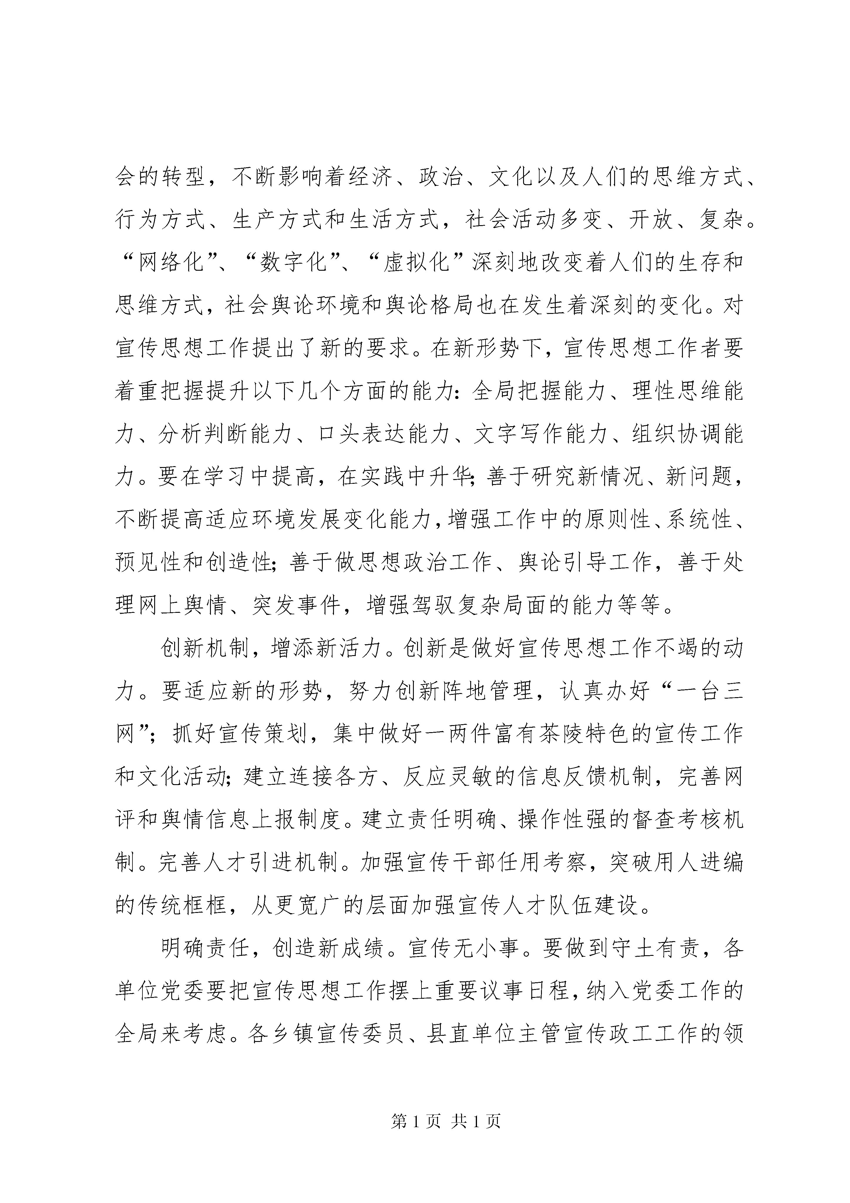 全县宣传思想工作大会讲话稿同志们:今天,县委专门召开这次宣传思想工作会议,学习贯彻全国和省、市宣传思想工作会议精神,研究部署今后的全县宣传思想工作,这对于进一步开创新形势下我县宣传思想工作新局面,实现富民强县新跨越,具有十分重要的意义。刚才,同志全面回顾了年全县的宣传思想工作,对年的主要任务、工作重点作了安排和部署。同志宣读了表彰决定。县政协副主席做了重要讲话。我表示完全赞同,希望大家认真领会,结合实际抓好贯彻落实。借此机会,我首先向受表彰的先进单位和个人表示热烈的祝贺!下面,我讲三点意见。一、深刻领会当