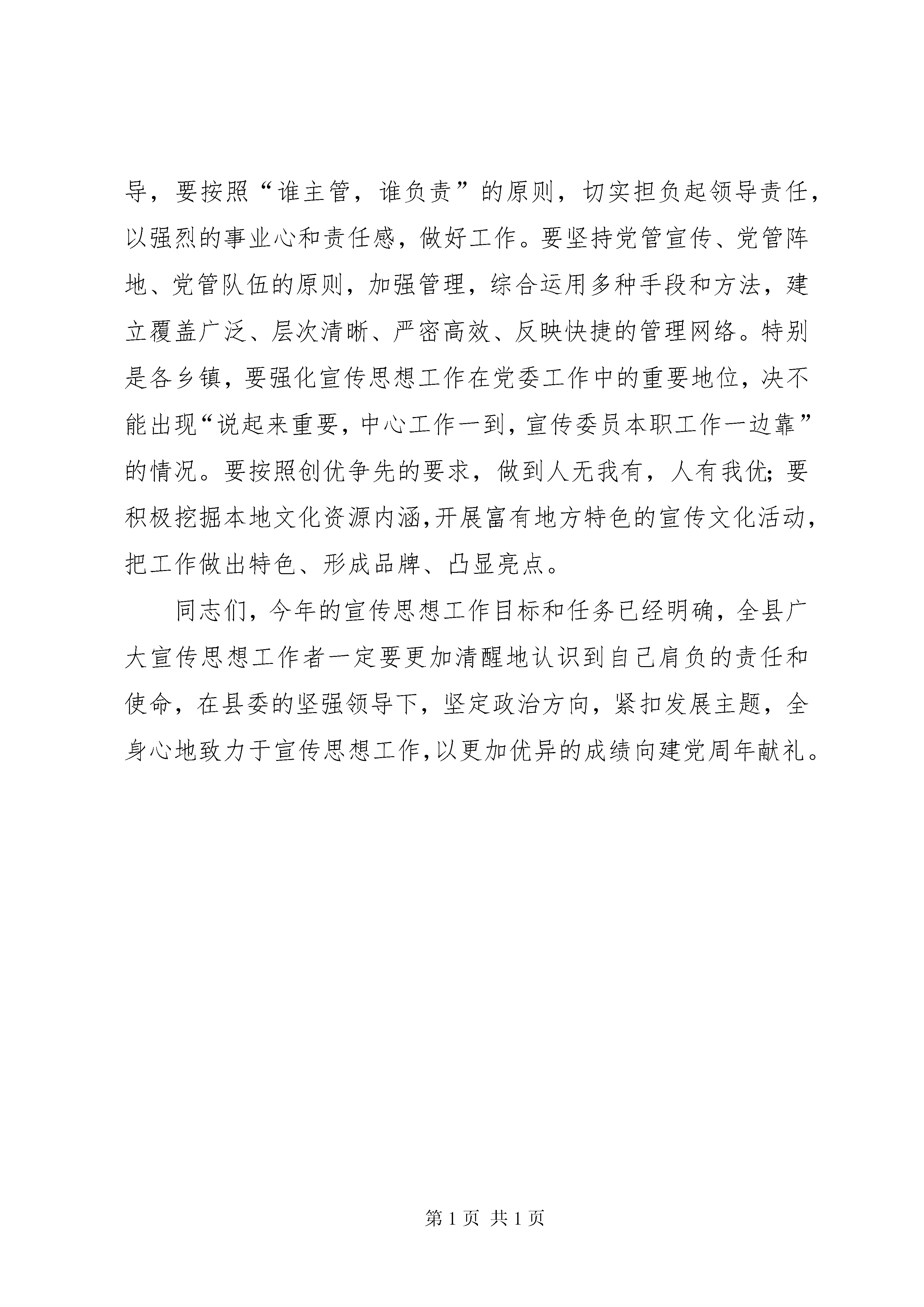 全县宣传思想工作大会讲话稿同志们:今天县委专门召开这次宣传思想工作会议学习贯彻全国和省、市宣传思想工作会议精神研究部署今后的全县宣传思想工作这对于进一步开创新形势下我县宣传思想工作新局面实现富民强县新跨越具有十分重要的意义。刚才同志全面回顾了年全县的宣传思想工作对年的主要任务、工作重点作了安排和部署。同志宣读了表彰决定。县政协副主席做了重要讲话。我表示完全赞同希望大家认真领会结合实际抓好贯彻落实。借此机会我首先向受表彰的先进单位和个人表示热烈的祝贺。下面我讲三点意见。