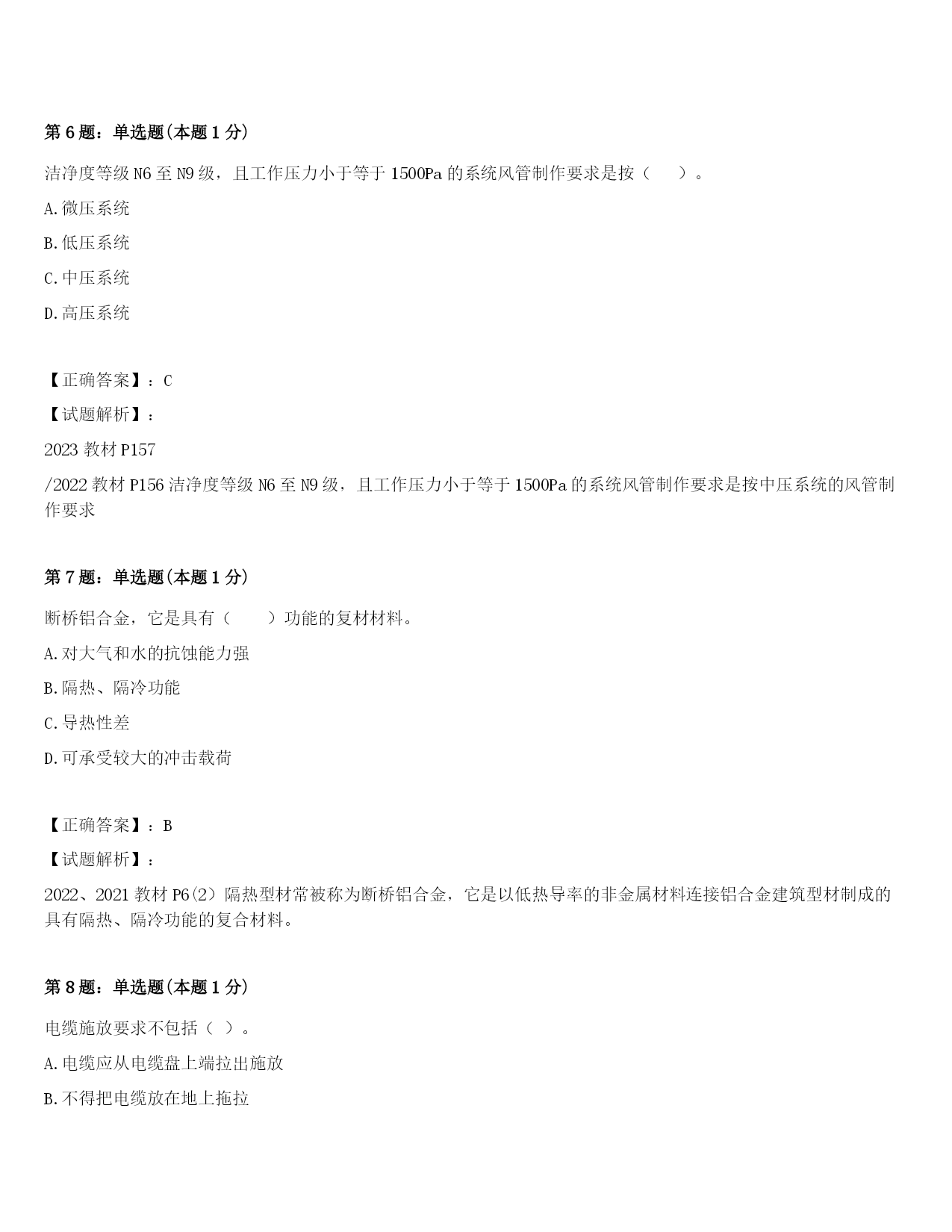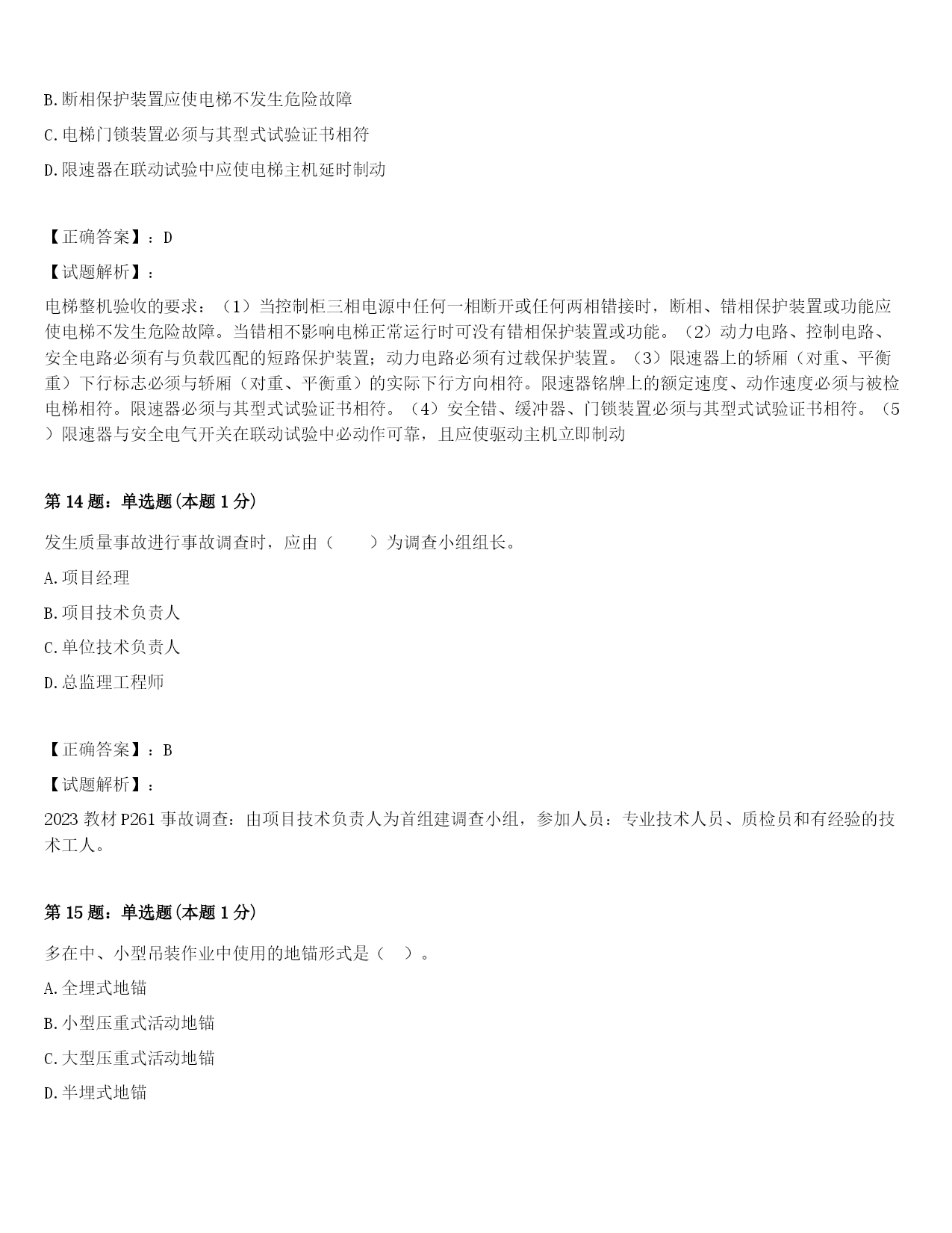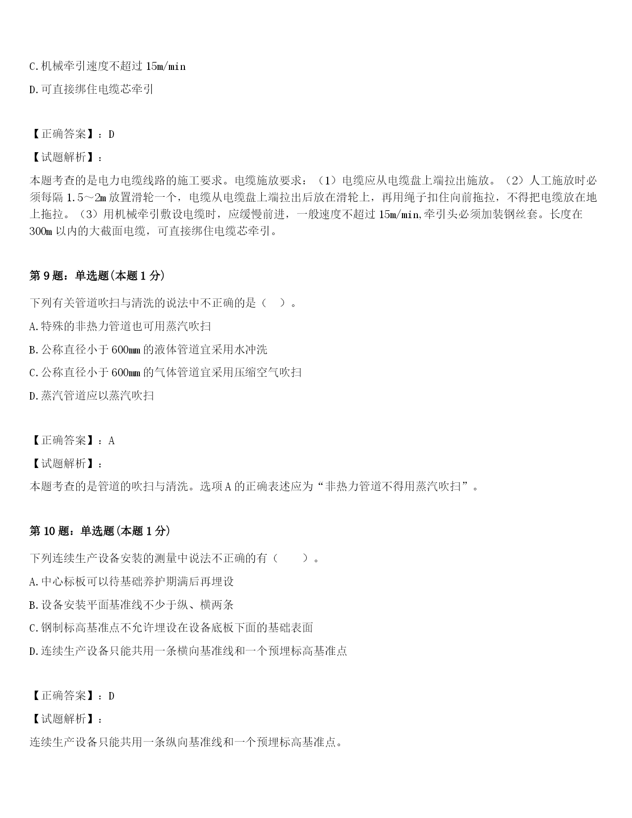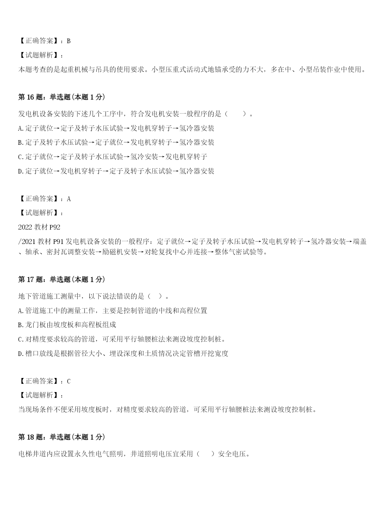 2024年咸宁市嘉鱼县二级建造师考试《机电工程管理与实务》考前冲刺预测试卷及答案第1题:单选题(本题1分)工程中最常见的合同变更形式是()。A.签署会谈纪要B.签变更协议C.设计变更D.工程变更指令【正确答案】:D【试题解析】:本题考查的是施工合同变更与索赔。机电工程项目合同变更形式:业主或工程师在工程施工中行使合同赋予的权力,发出各种变更指令,最常见的是工程变更指令。在实际工程中,这种变更较多。第2题:单选题(本题1分)有关母线的连接固定,正确的是()。A.母线应在找正及固定前,进行导体的焊接B.母线与