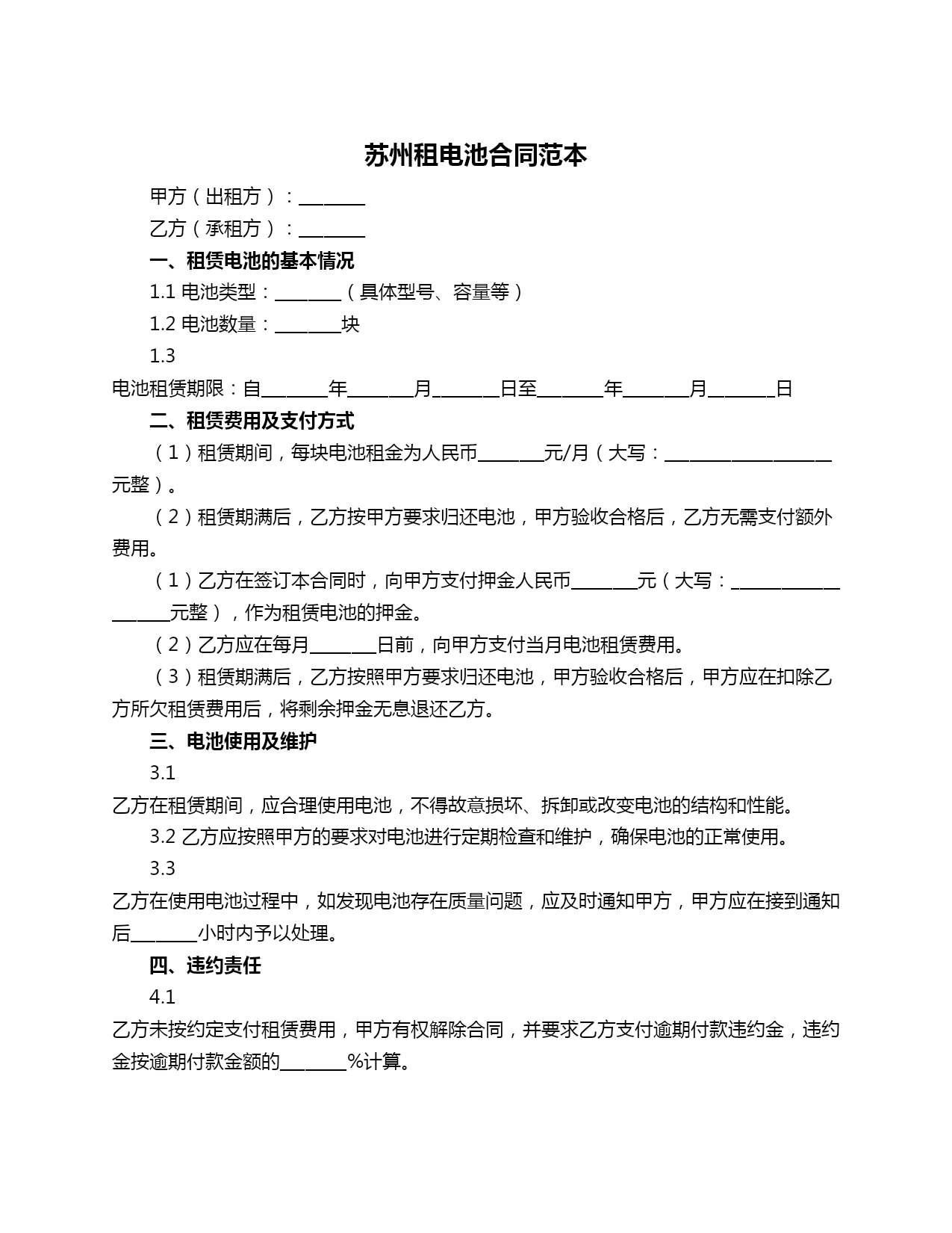 苏州租电池合同范本甲方(出租方):________乙方(承租方):________一、租赁电池的基本情况1.1电池类型:________(具体型号、容量等)1.2电池数量:________块1.3电池租赁期限:自________年________月________日至________年________月________日二、租赁费用及支付方式(1)租赁期间,每块电池租金为人民币________元/月(大写:____________________元整)。(2)租赁期满后,乙方按甲方要求归还电池,甲方验收合