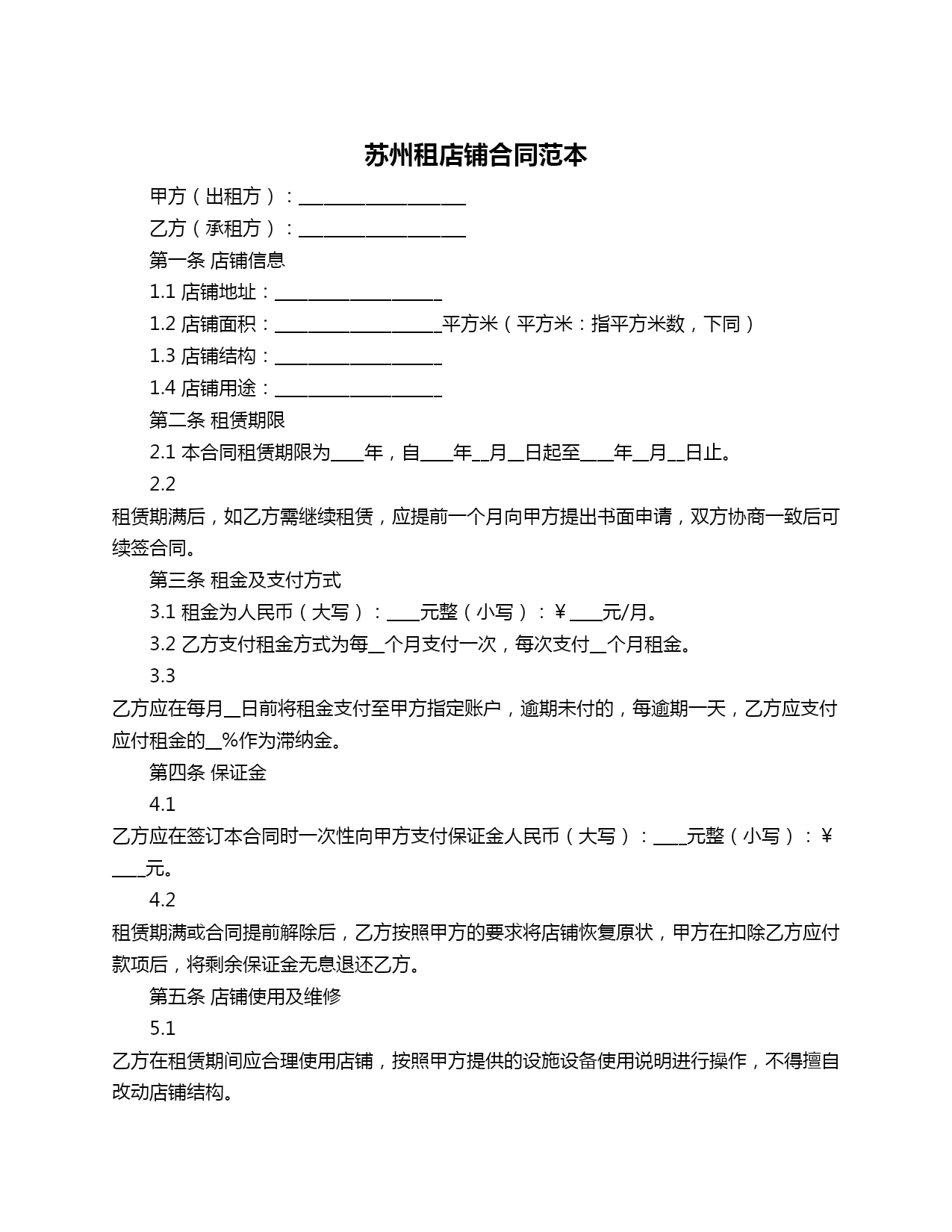 苏州租店铺合同范本甲方(出租方):____________________乙方(承租方):____________________第一条店铺信息1.1店铺地址:____________________1.2店铺面积:____________________平方米(平方米:指平方米数,下同)1.3店铺结构:____________________1.4店铺用途:____________________第二条租赁期限2.1本合同租赁期限为____年,自____年__月__日起至____年__月__日止。2.2