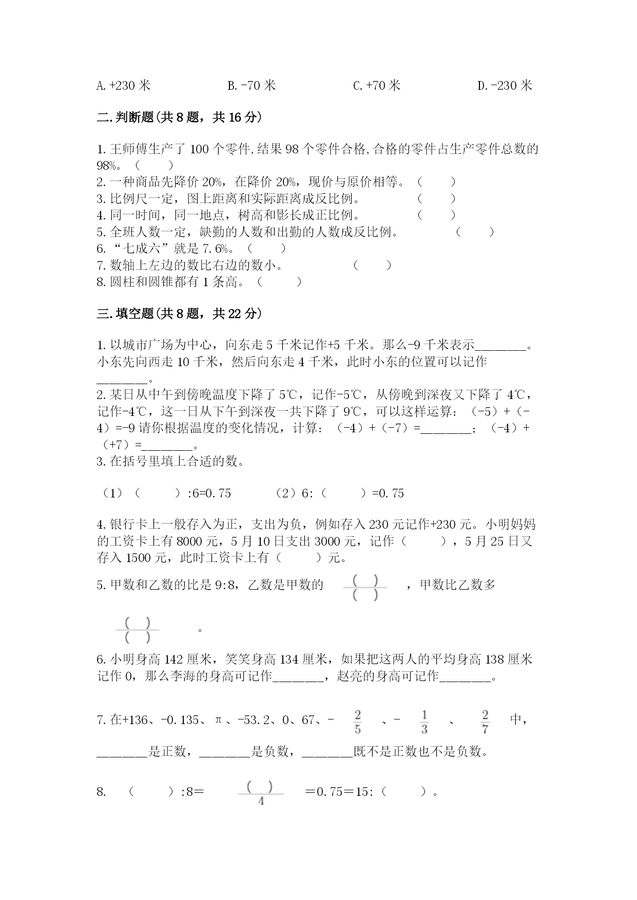苏教版六年级下册期末真题卷一.选择题(共8题,共16分)1.把,33.3%,3.3,﹣0.33,0按从小到大的顺序排列是()。A.>33.3%>3.3>0>﹣0.33B.﹣0.33<0<33.3%<<3.3C.0<﹣0.33<33.3%<<3.32.小明的期末数学成绩高于平均分3分记为+3,小亮的分数记为-4,说明()。A.高于平均分4分B.低于平均分4分C.小明和小亮相差4分3.下列说法正确的是()。A.两个不同素数的和一定是合数。B.9℃与-1℃相差8℃。C.假分数的倒数一定小于1。D.一个三角形的三