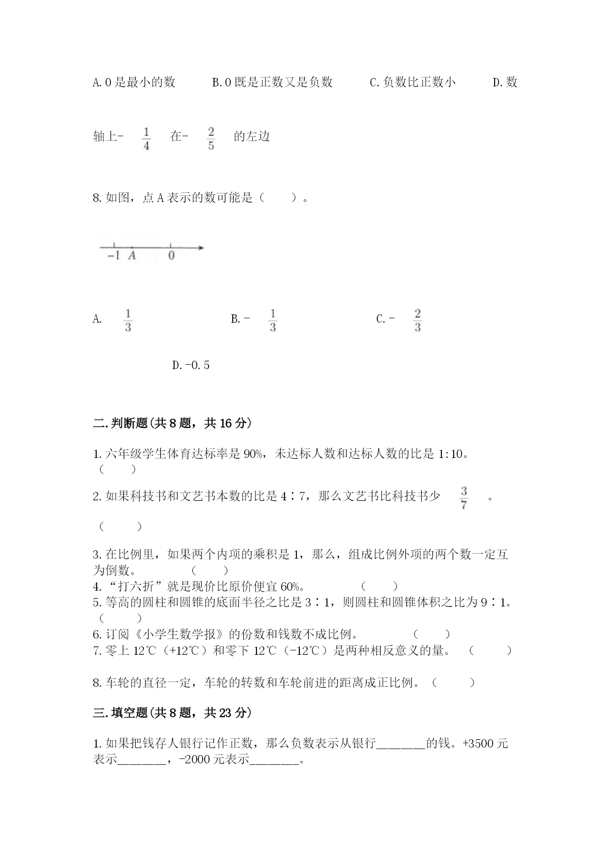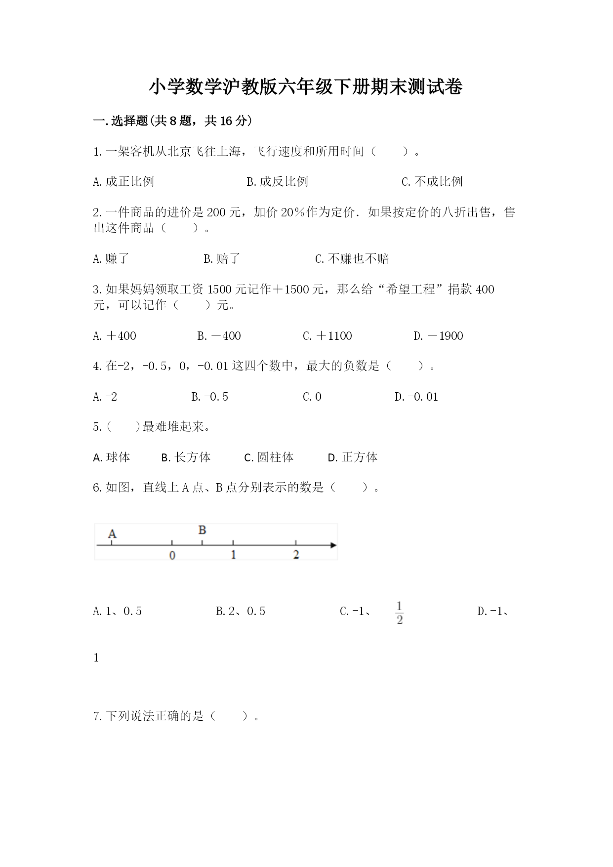 小学数学沪教版六年级下册期末测试卷一.选择题(共8题,共16分)1.一架客机从北京飞往上海,飞行速度和所用时间()。A.成正比例B.成反比例C.不成比例2.一件商品的进价是200元,加价20%作为定价.如果按定价的八折出售,售出这件商品()。A.赚了B.赔了C.不赚也不赔3.如果妈妈领取工资1500元记作+1500元,那么给“希望工程”捐款400元,可以记作()元。A.+400B.-400C.+1100D.-19004.在-2,-0.5,0,-0.01这四个数中,最大的负数是()。A.-2B.-0.5C.