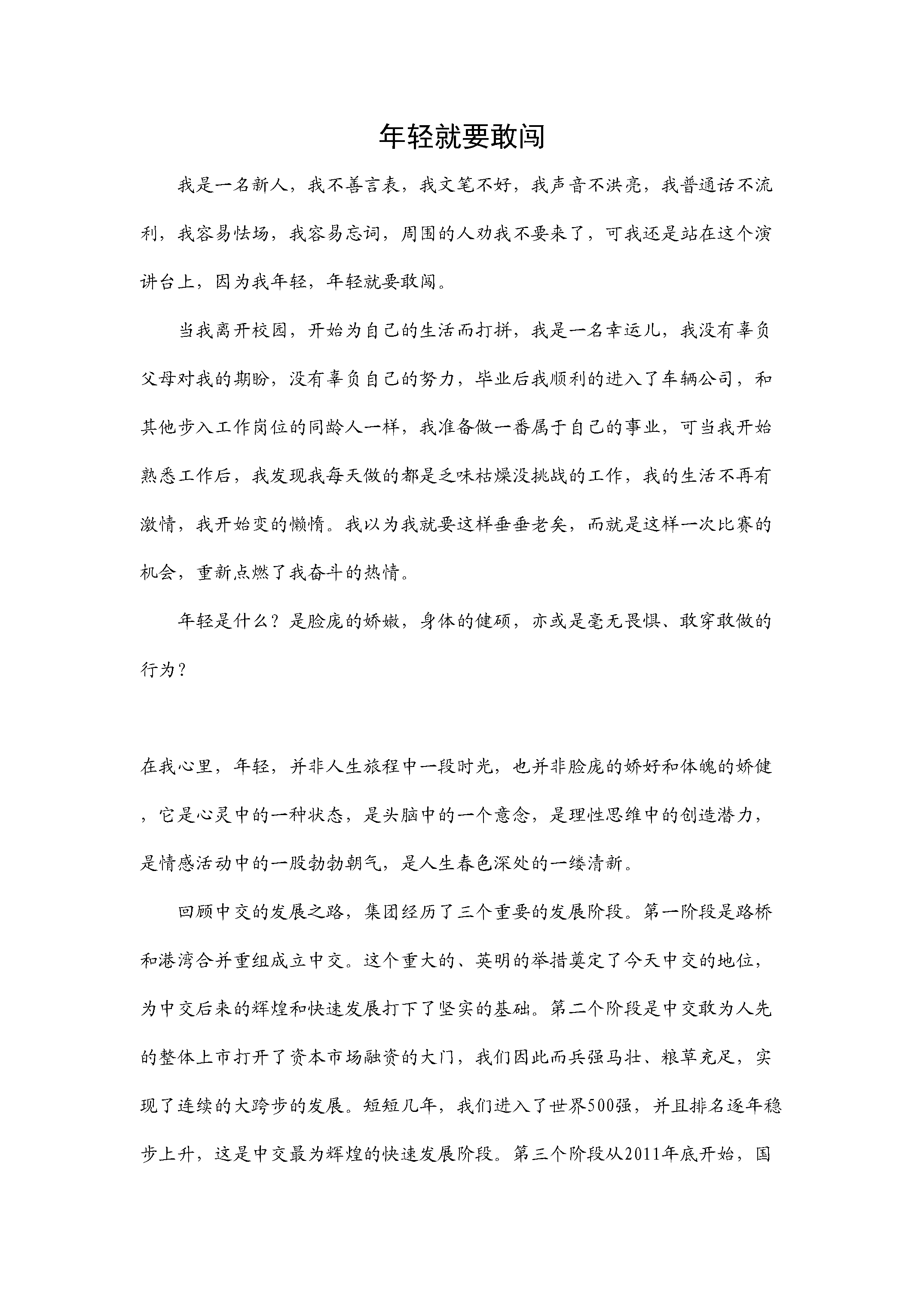 年轻就要敢闯我是一名新人,我不善言表,我文笔不好,我声音不洪亮,我普通话不流利,我容易怯场,我容易忘词,周围的人劝我不要来了,可我还是站在这个演讲台上,因为我年轻,年轻就要敢闯。当我离开校园,开始为自己的生活而打拼,我是一名幸运儿,我没有辜负父母对我的期盼,没有辜负自己的努力,毕业后我顺利的进入了车辆公司,和其他步入工作岗位的同龄人一样,我准备做一番属于自己的事业,可当我开始熟悉工作后,我发现我每天做的都是乏味枯燥没挑战的工作,我的生活不再有激情,我开始变的懒惰。我以为我就要这样垂垂老矣,而就是这样一次比