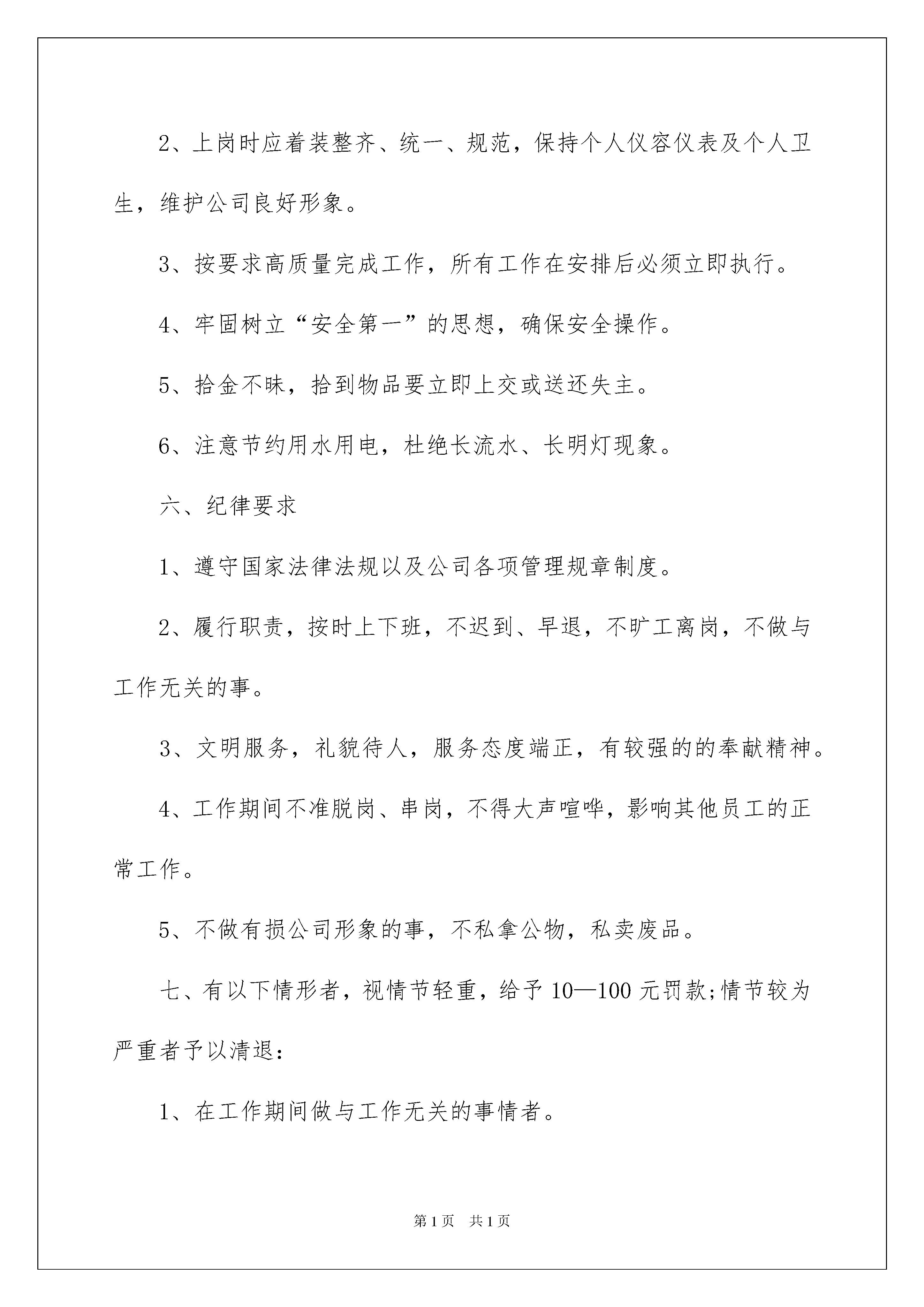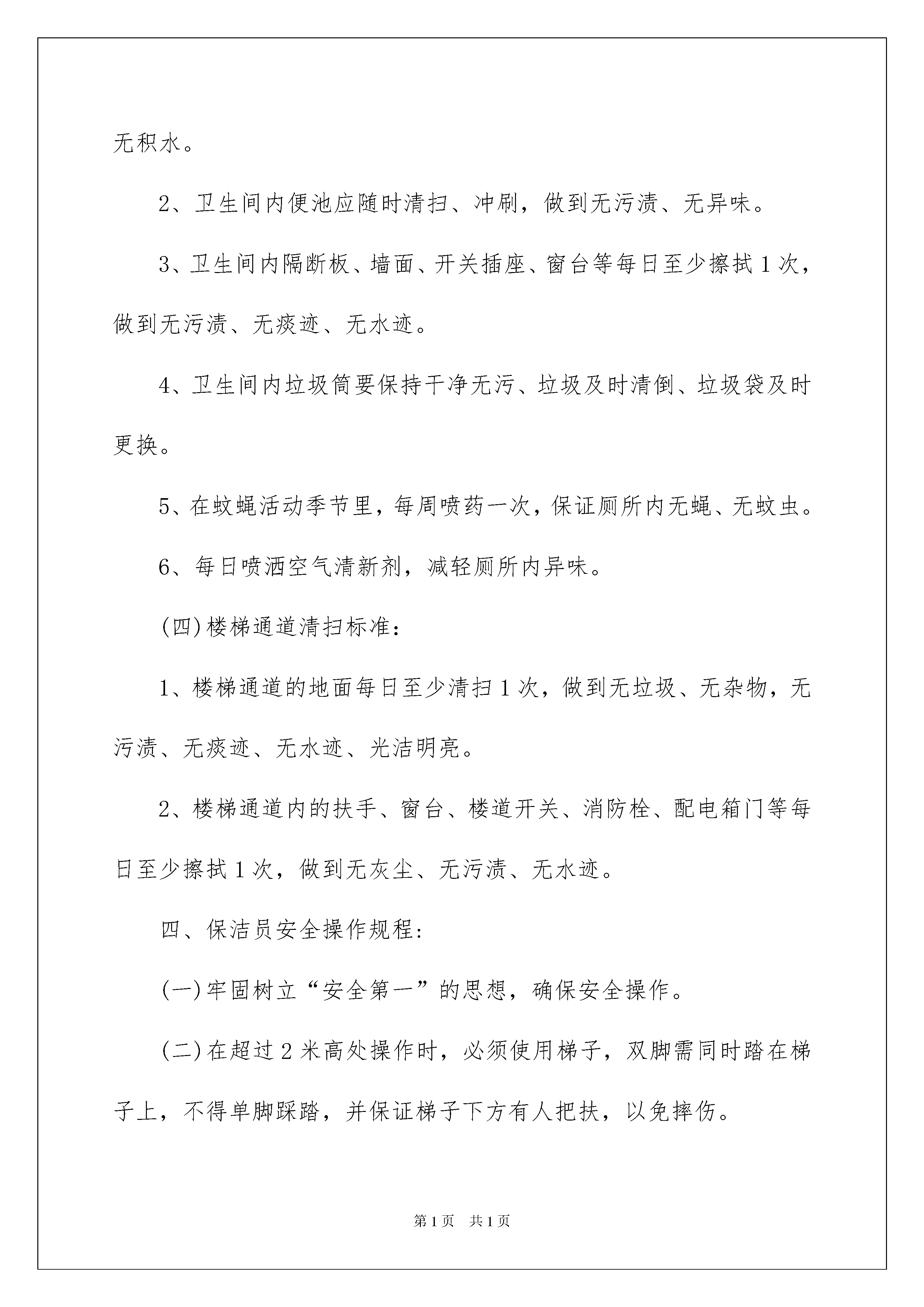 公司保洁员管理制度公司保洁员管理制度10篇在社会发展不断提速的今天,制度在生活中的使用越来越广泛,制度泛指以规则或运作模式,规范个体行动的一种社会结构。想学习拟定制度却不知道该请教谁?下面是小编为大家整理的公司保洁员管理制度,希望能够帮助到大家。公司保洁员管理制度1一、保洁员岗位职责:1、严格遵守公司各项规章制度。2、文明服务、礼貌待人,并注意保持个人的仪容仪表,树立良好形象。3、爱岗敬业,听从上级领导指挥,在规定时间内按照工作标准,保质保量地完成各自分管区域内的保洁工作。4、遵守考勤制度,按时上下班,不