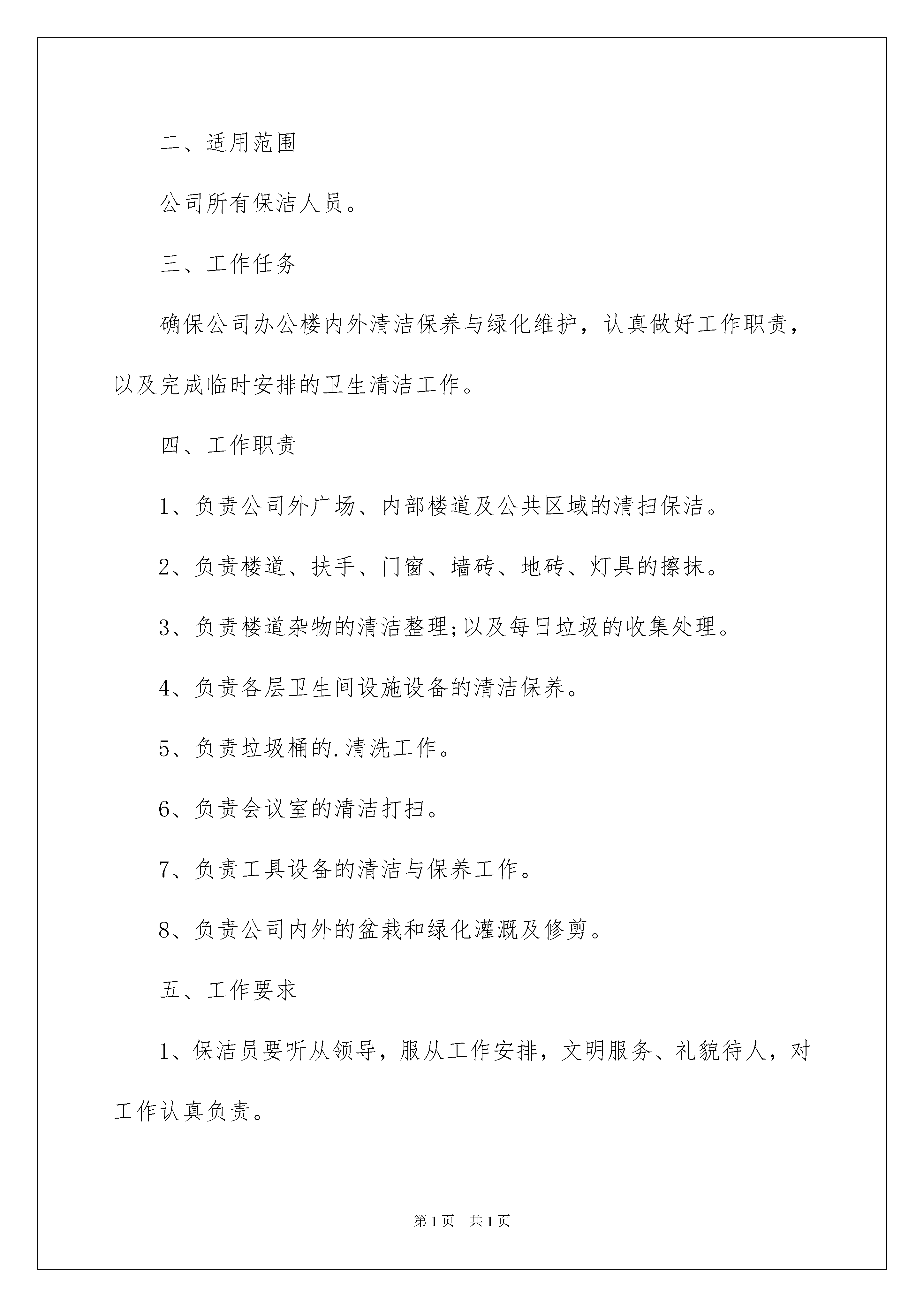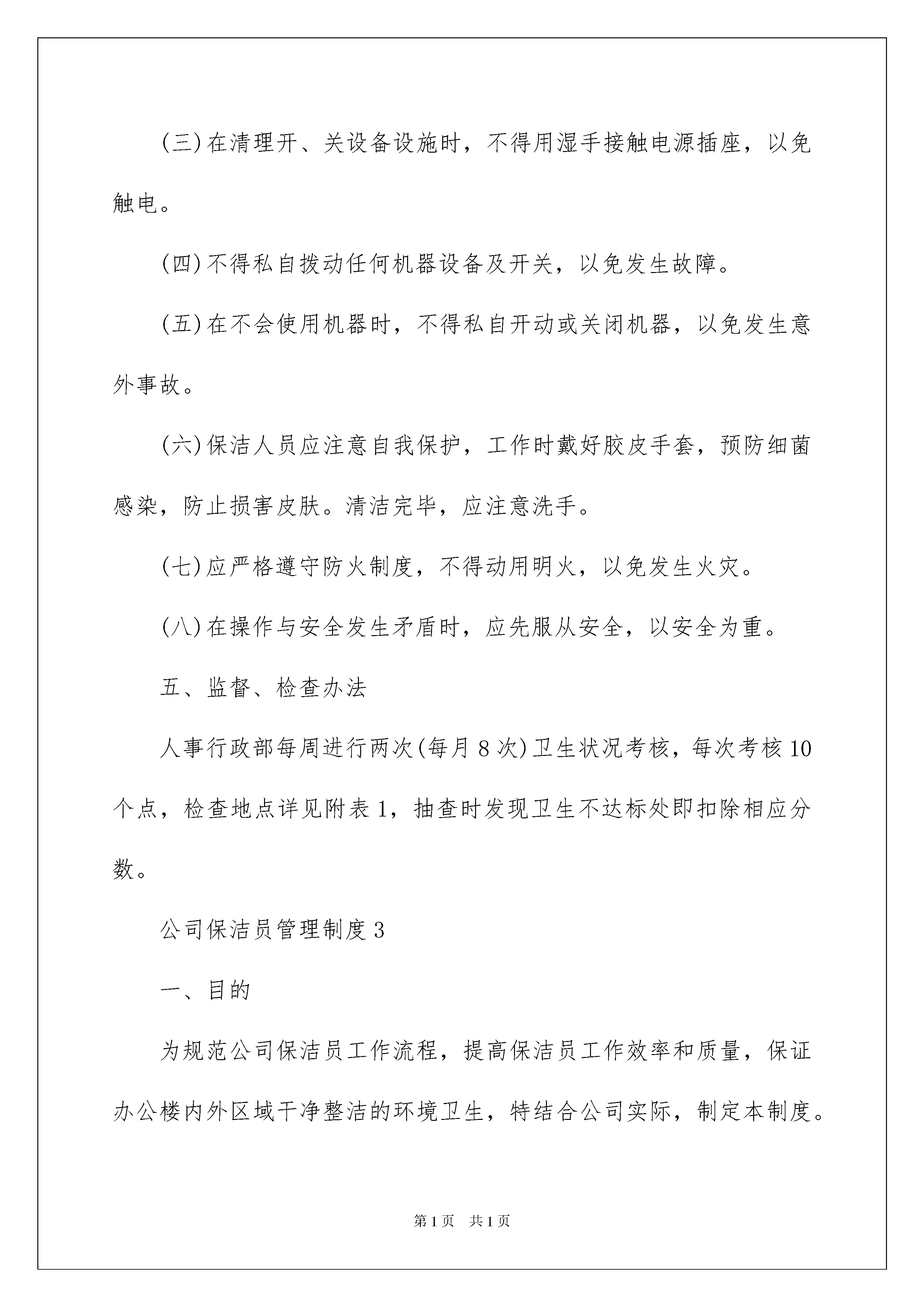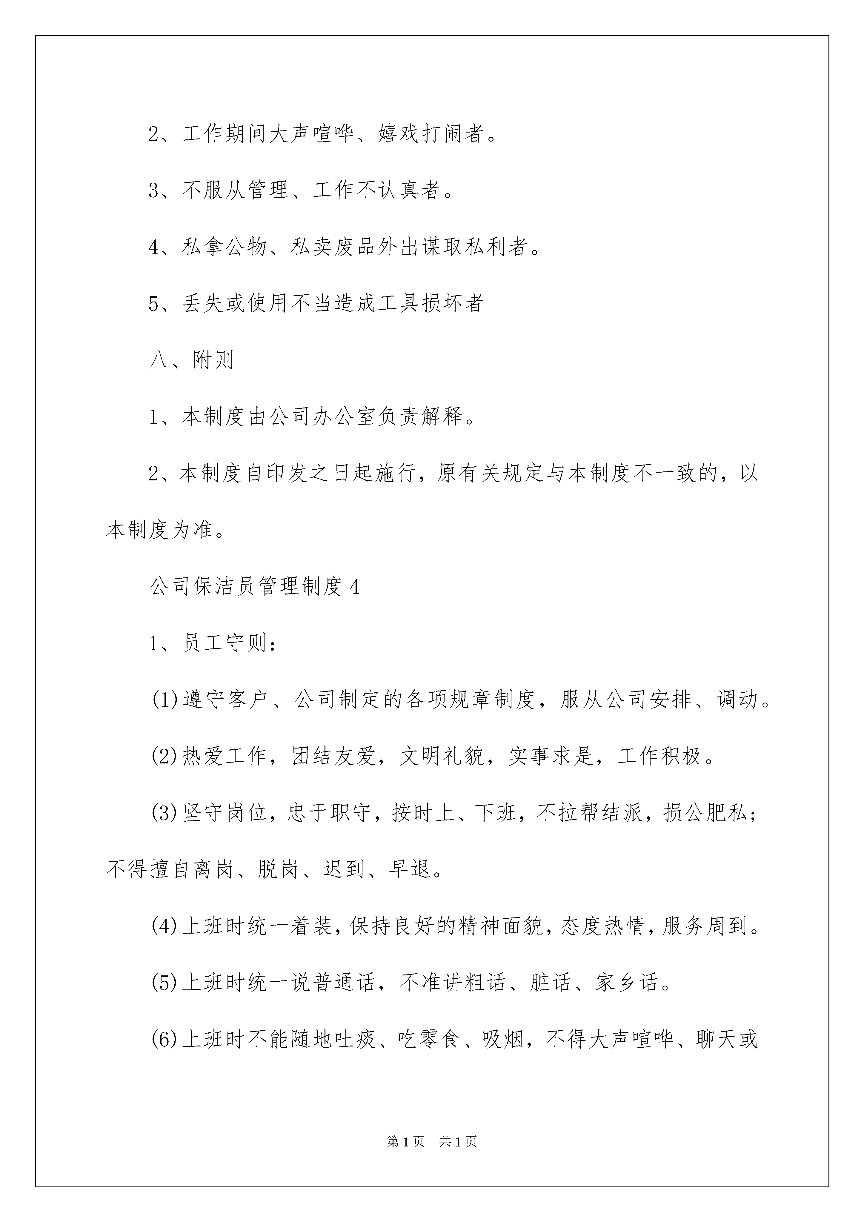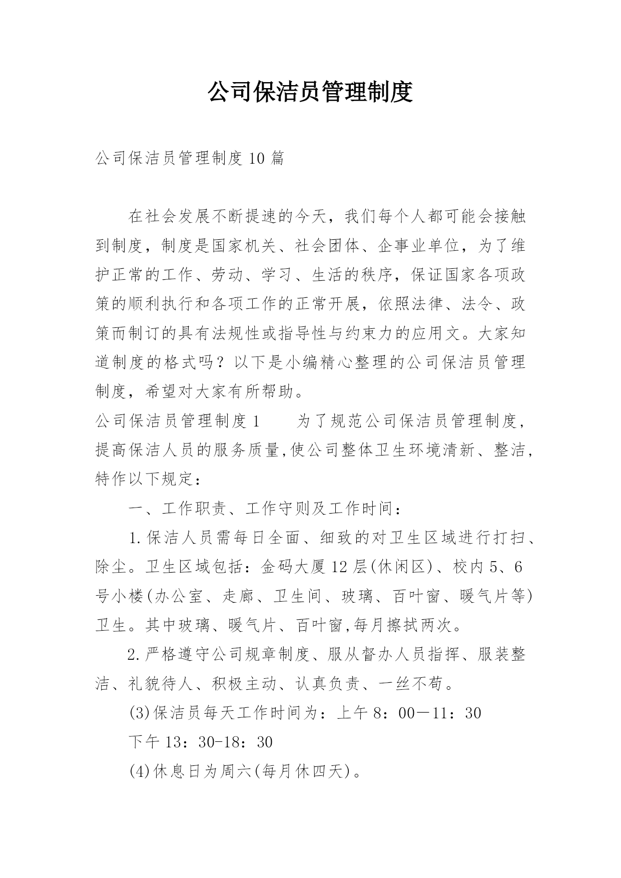 公司保洁员管理制度公司保洁员管理制度10篇在社会发展不断提速的今天,我们每个人都可能会接触到制度,制度是国家机关、社会团体、企事业单位,为了维护正常的工作、劳动、学习、生活的秩序,保证国家各项政策的顺利执行和各项工作的正常开展,依照法律、法令、政策而制订的具有法规性或指导性与约束力的应用文。大家知道制度的格式吗?以下是小编精心整理的公司保洁员管理制度,希望对大家有所帮助。公司保洁员管理制度1为了规范公司保洁员管理制度,提高保洁人员的服务质量,使公司整体卫生环境清新、整洁,特作以下规定:一、工作职责、工作守
