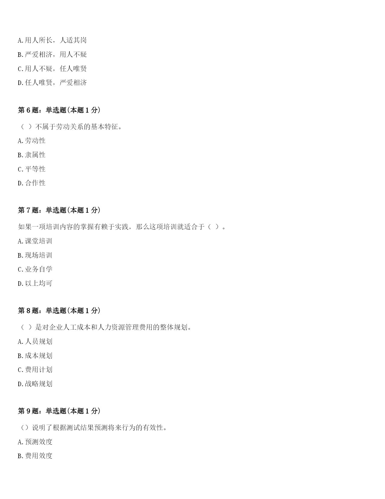 2024年四川省雅安市名山县四级人力资源管理师《理论知识》高分通关卷含解析第1题:单选题(本题1分)劳务派遣单位未经许可,擅自经营劳务派遣业务的,由劳动行政部门责令停止违法行为,没收违法所得,并处违法所得1倍以上5倍以下的罚款;没有违法所得的,可以处()以下的罚款。A.15万元B.10万元C.5万元D.3万元第2题:单选题(本题1分)企业法定代表人对本单位的安全生产负()。A.全面责任B.安全生产技术领导责任C.直接责任D.安全生产技术监督责任第3题:单选题(本题1分)()是指企业在某一特定时期内,在某种