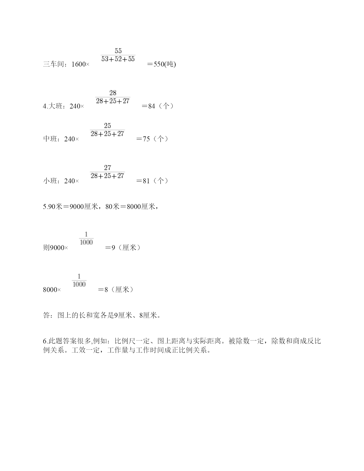 苏教版六年级下册数学第六单元正比例和反比例测试卷一.选择题(共6题,共12分)1.下面三句话中,正确的是()。A.圆的周长和半径成正比例B.平行四边形不一定是轴对称图形C.一个三角形的边长度分别是3cm、4cm、7cm2.小洋家客厅长5米,宽3.8米,画在练习本上,选用比例尺()较合适。A.B.C.3.三个数的比是1∶2∶3,平均数是60,则最大的一个数是()。A.30B.90C.604.在一幅地区图上附一条注有数目的线段如下:这幅图的比例尺是()。A.B.C.5.一个长方形的操场,长80米,宽50米,在