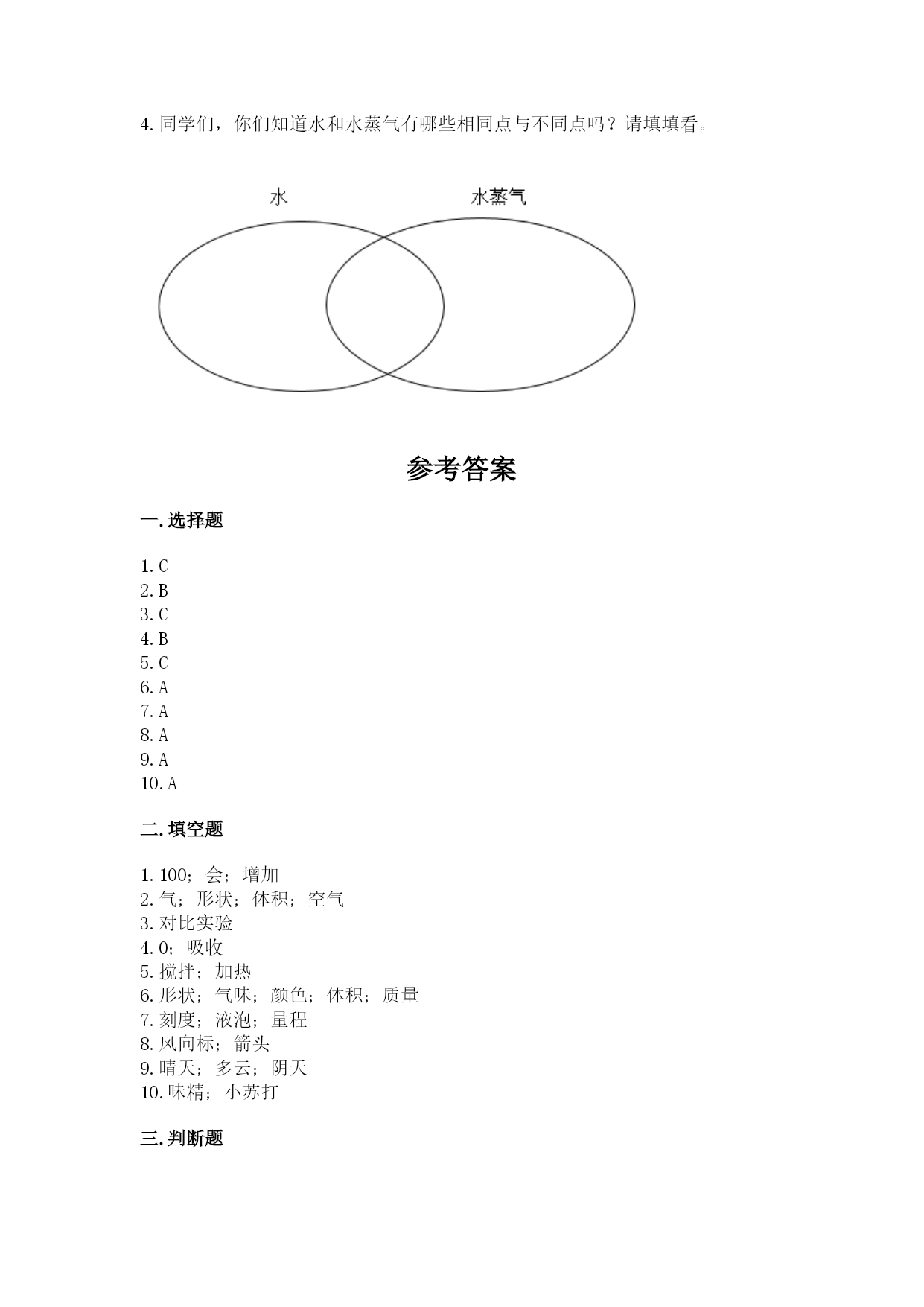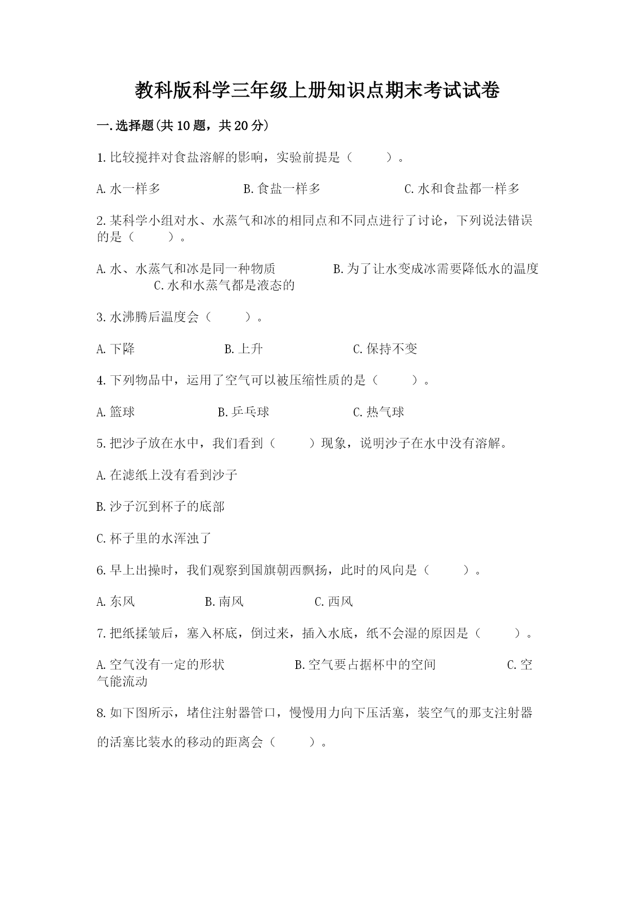 教科版科学三年级上册知识点期末考试试卷一.选择题(共10题,共20分)1.比较搅拌对食盐溶解的影响,实验前提是()。A.水一样多B.食盐一样多C.水和食盐都一样多2.某科学小组对水、水蒸气和冰的相同点和不同点进行了讨论,下列说法错误的是()。A.水、水蒸气和冰是同一种物质B.为了让水变成冰需要降低水的温度C.水和水蒸气都是液态的3.水沸腾后温度会()。A.下降B.上升C.保持不变4.下列物品中,运用了空气可以被压缩性质的是()。A.篮球B.乒乓球C.热气球5.把沙子放在水中,我们看到()现象,说明沙子在水