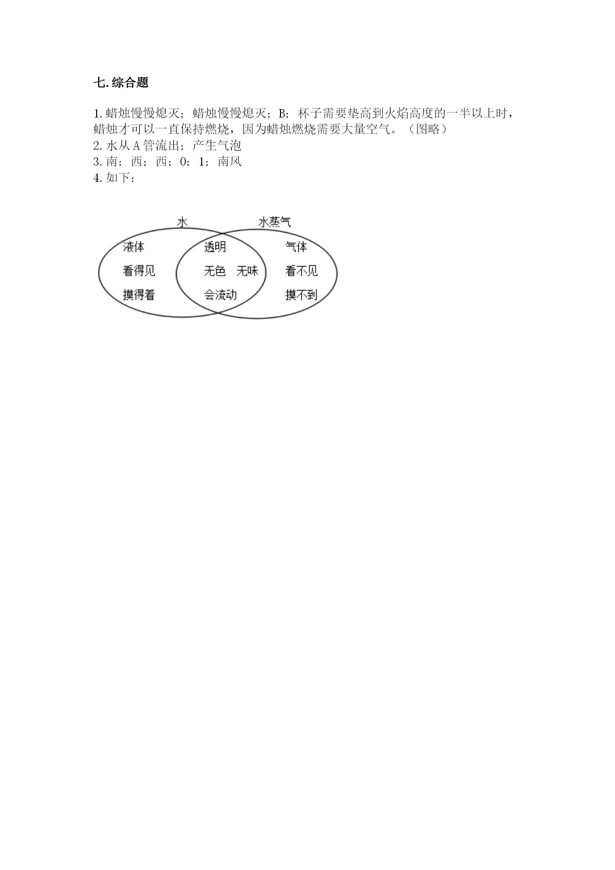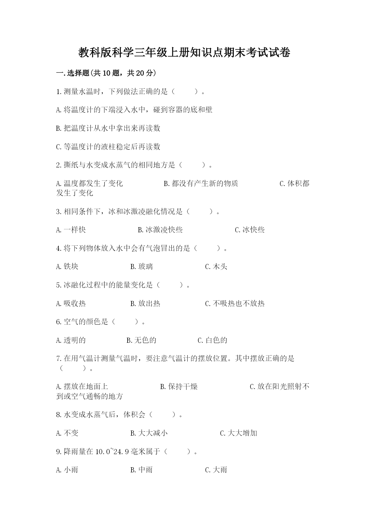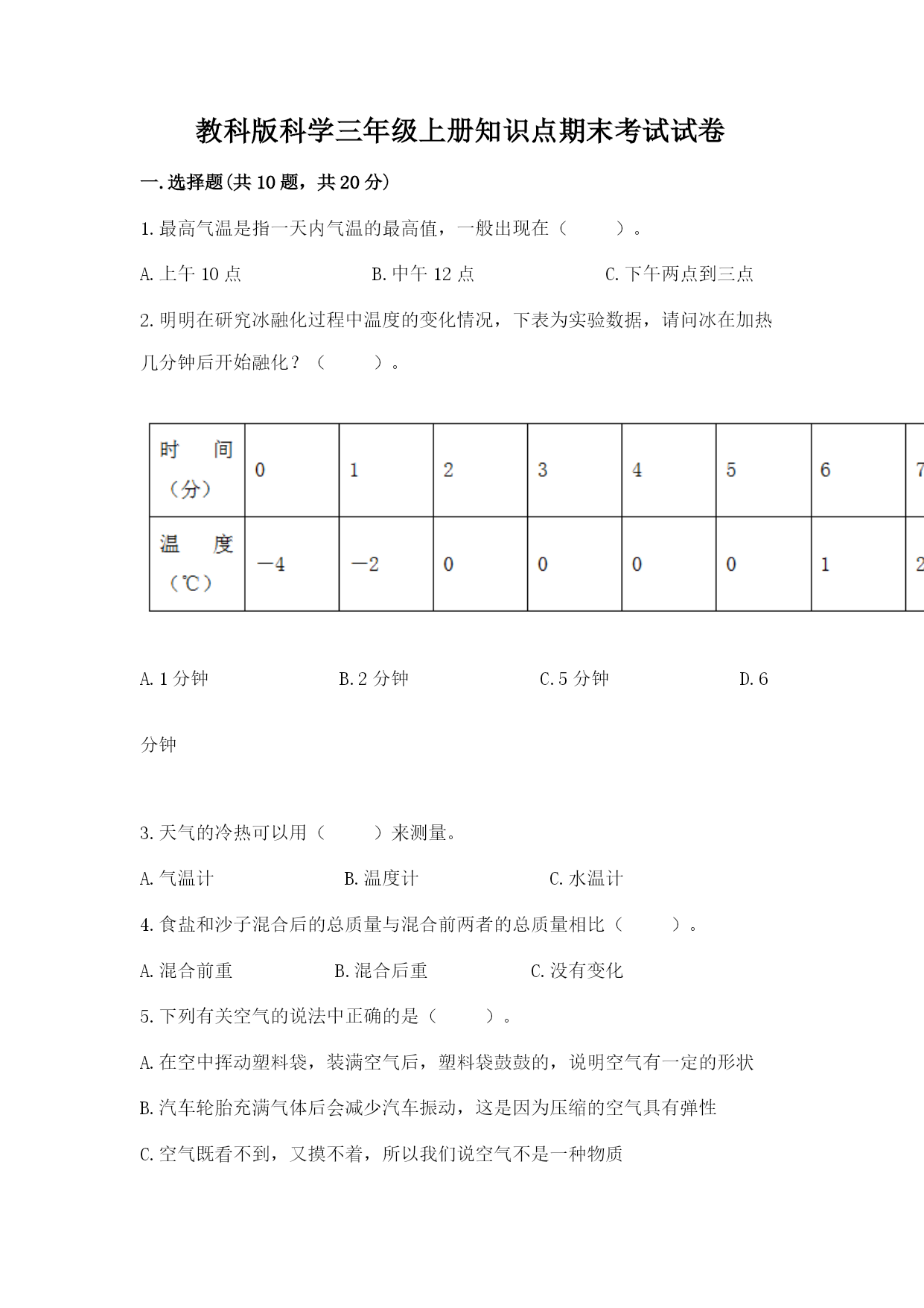 教科版科学三年级上册知识点期末考试试卷一.选择题(共10题,共20分)1.最高气温是指一天内气温的最高值,一般出现在()。A.上午10点B.中午12点C.下午两点到三点2.明明在研究冰融化过程中温度的变化情况,下表为实验数据,请问冰在加热几分钟后开始融化?()。A.1分钟B.2分钟C.5分钟D.6分钟3.天气的冷热可以用()来测量。A.气温计B.温度计C.水温计4.食盐和沙子混合后的总质量与混合前两者的总质量相比()。A.混合前重B.混合后重C.没有变化5.下列有关空气的说法中正确的是()。A.在空中挥动