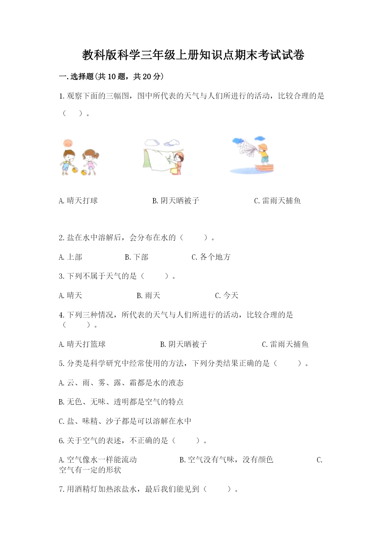 教科版科学三年级上册知识点期末考试试卷一.选择题(共10题,共20分)1.观察下面的三幅图,图中所代表的天气与人们所进行的活动,比较合理的是()。A.晴天打球B.阴天晒被子C.雷雨天捕鱼2.盐在水中溶解后,会分布在水的()。A.上部B.下部C.各个地方3.下列不属于天气的是()。A.晴天B.雨天C.今天4.下列三种情况,所代表的天气与人们所进行的活动,比较合理的是()。A.晴天打篮球B.阴天晒被子C.雷雨天捕鱼5.分类是科学研究中经常使用的方法,下列分类结果正确的是()。A.云、雨、雾、露、霜都是水的液态