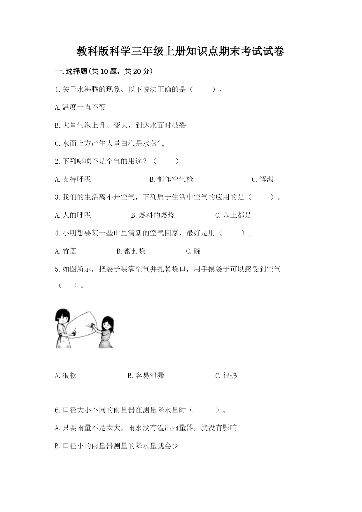 教科版科学三年级上册知识点期末考试试卷一.选择题(共10题,共20分)1.关于水沸腾的现象、以下说法正确的是()。A.温度一直不变B.大量气泡上升、变大,到达水面时破裂C.水面上方产生大量白汽是水蒸气2.下列哪项不是空气的用途?()A.支持呼吸B.制作空气枪C.解渴3.我们的生活离不开空气,下列属于生活中空气的应用的是()。A.人的呼吸B.燃料的燃烧C.以上都是4.小明想要装一些山里清新的空气回家,最好是用()。A.竹篮B.密封袋C.碗5.如图所示,把袋子装满空气并扎紧袋口,用手摸袋子可以感受到空气()。