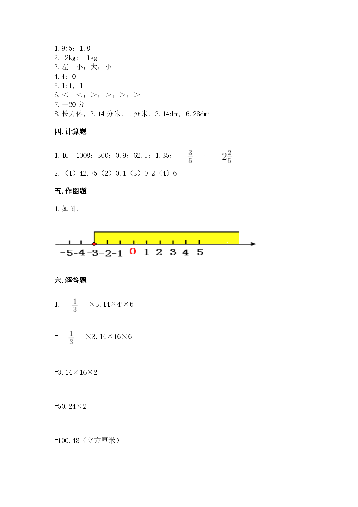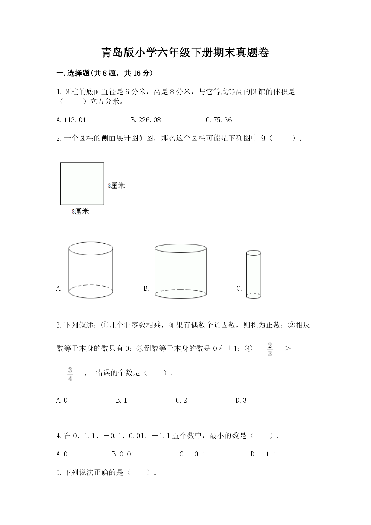 青岛版小学六年级下册期末真题卷一.选择题(共8题,共16分)1.圆柱的底面直径是6分米,高是8分米,与它等底等高的圆锥的体积是()立方分米。A.113.04B.226.08C.75.362.一个圆柱的侧面展开图如图,那么这个圆柱可能是下列图中的()。A.B.C.3.下列叙述:①几个非零数相乘,如果有偶数个负因数,则积为正数;②相反数等于本身的数只有0;③倒数等于本身的数是0和±1;④->-,错误的个数是()。A.0B.1C.2D.34.在0、1.1、-0.1、0.01、-1.1五个数中,最小的数是()。A
