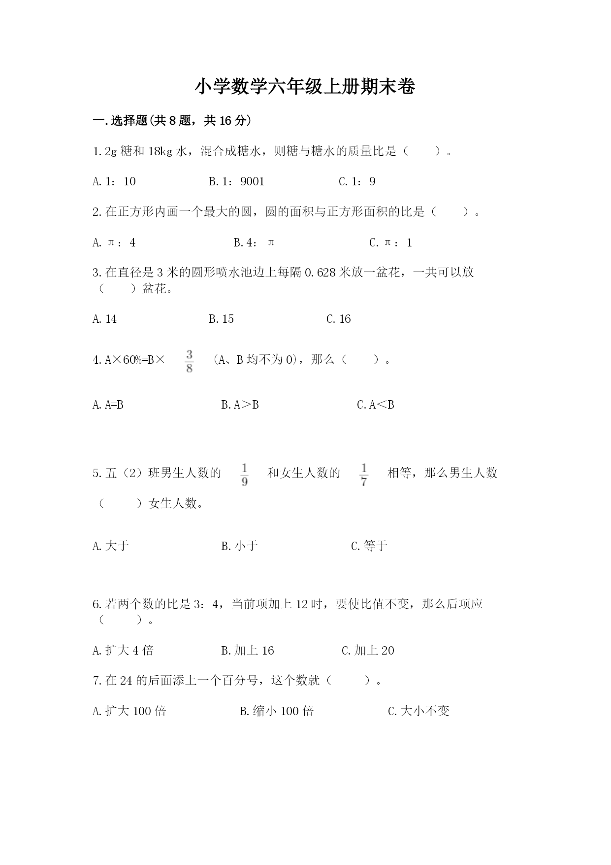 小学六年级上册数学试卷期末卷一.选择题(共8题,共16分)1.在一个长10厘米、宽5厘米的长方形中画一个最大的圆,它的半径是()。A.10厘米B.5厘米C.2.5厘米D.1.5厘米2.一个等腰三角形的两个内角的度数比是4∶1,这个三角形是()。A.锐角三角形B.直角三角形C.钝角三角形D.锐角三角形或钝角三角形3.下面()杯中的糖水最甜。4.一件衬衫,先提价10%,再降价,则原价比新价()。A.相同B.高C.低D.无法确定5.甲数的等于乙数的,那么甲数()乙数。(甲数乙数不为0)A.大于B.小于C.等于6
