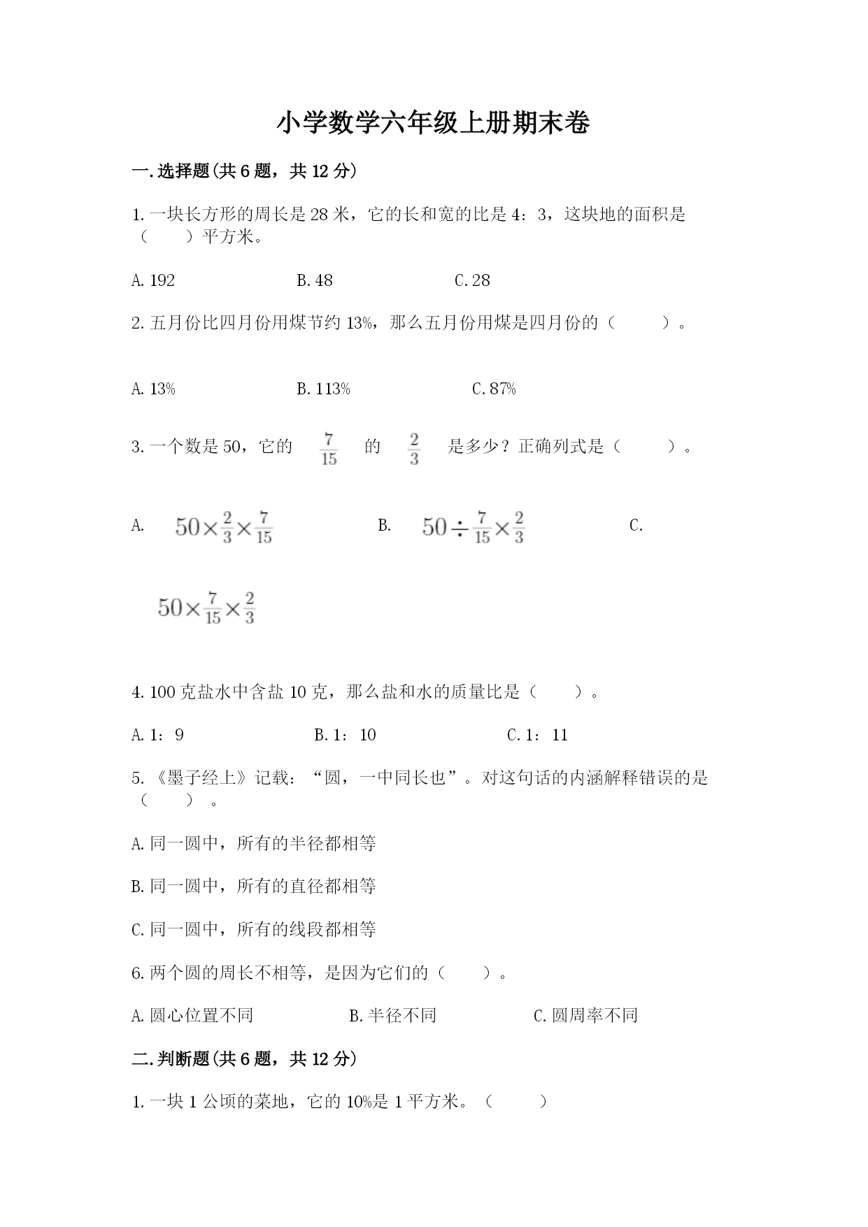 小学数学六年级上册期末卷一.选择题(共6题,共12分)1.一块长方形的周长是28米,它的长和宽的比是4:3,这块地的面积是()平方米。A.192B.48C.282.五月份比四月份用煤节约13%,那么五月份用煤是四月份的()。A.13%B.113%C.87%3.一个数是50,它的的是多少?正确列式是()。A.B.C.4.100克盐水中含盐10克,那么盐和水的质量比是()。A.1:9B.1:10C.1:115.《墨子经上》记载:“圆,一中同长也”。对这句话的内涵解释错误的是()。A.同一圆中,所有的半径都相等