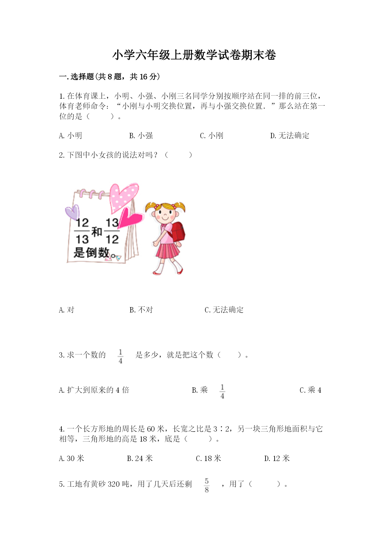 小学六年级上册数学试卷期末卷一.选择题(共8题,共16分)1.在体育课上,小明、小强、小刚三名同学分别按顺序站在同一排的前三位,体育老师命令:“小刚与小明交换位置,再与小强交换位置.”那么站在第一位的是()。A.小明B.小强C.小刚D.无法确定2.下图中小女孩的说法对吗?()A.对B.不对C.无法确定3.求一个数的是多少,就是把这个数()。A.扩大到原来的4倍B.乘C.乘44.一个长方形地的周长是60米,长宽之比是3∶2,另一块三角形地面积与它相等,三角形地的高是18米,底是()。A.30米B.24米C.