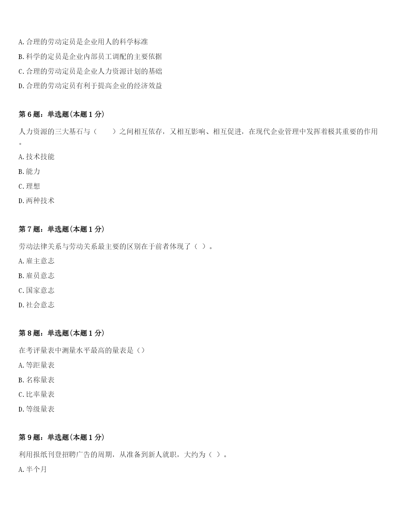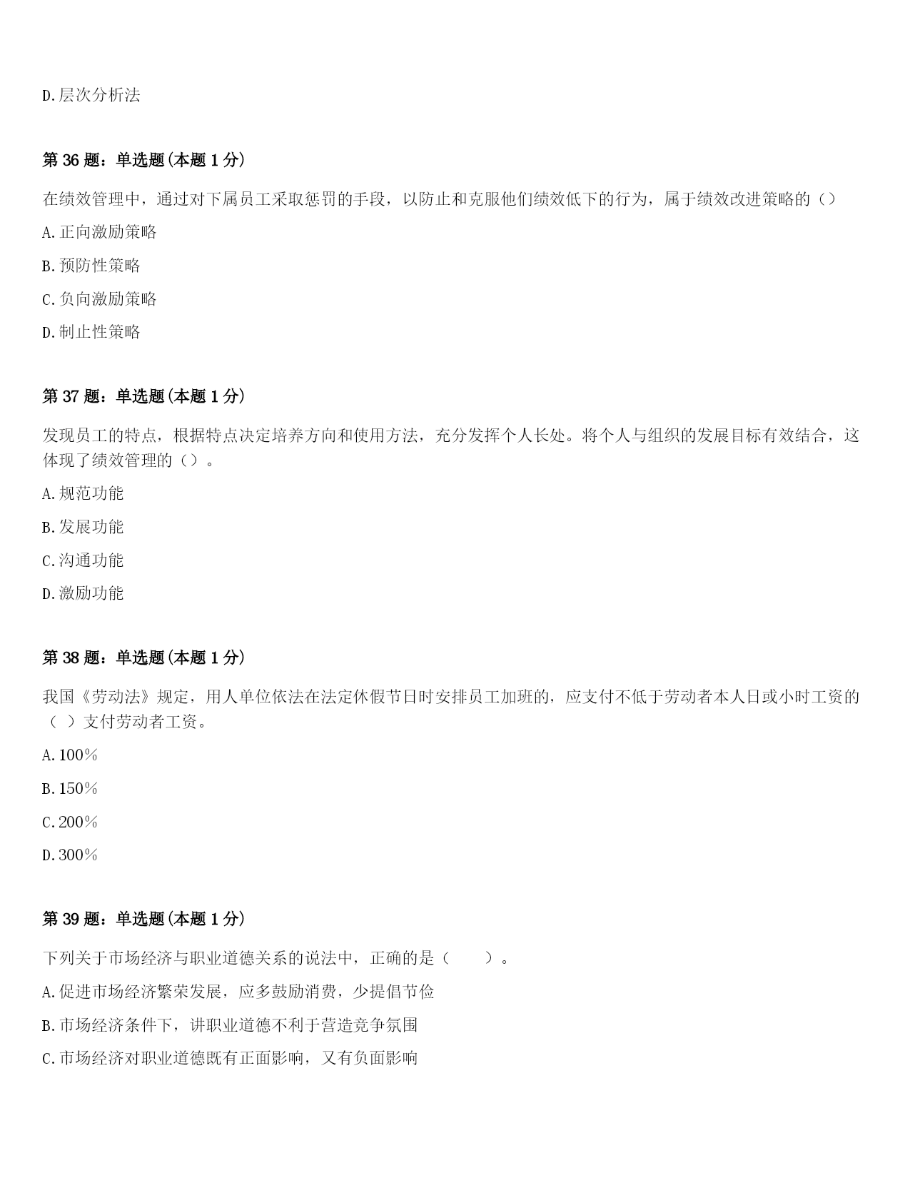 2024年湖南省常德市四级人力资源管理师《理论知识》模拟预测试卷完整版第1题:单选题(本题1分)关于办事公道不正确的表述是()。A.坚持原则,实事求是B.实行平均主义C.不怕“权势”压力D.不徇私情第2题:单选题(本题1分)如果应聘者的肢体语言是咬嘴唇,这表示其()A.紧张、不耐烦、自负B.紧张、害怕、焦虑C.厌倦、自以为是、紧张D.不同意、反感、生气第3题:单选题(本题1分)下列()不属于人工成本中的工资项目。A.计时工资B.计件工资C.职务工资D.员工住房基金第4题:单选题(本题1分)()是员工超额劳