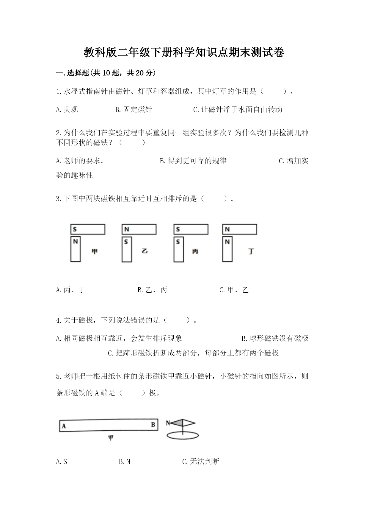 教科版二年级下册科学知识点期末测试卷一.选择题(共10题,共20分)1.下列事物中没有用到磁铁的是()。A.B.C.2.很早以前,人们在寻找铁矿时,发现了一种能吸铁的矿石,他们把这种矿石叫做()A.磁铁B.吸铁石C.磁石D.铁矿石3.磁铁上磁力最强的部分叫()。A.磁极B.磁力C.磁性4.现象()不可以说明条形磁铁有两个磁极。A.用回形针接触条形磁铁的不同部位,感受到两端的磁力大,中间的磁力小B.将磁铁放在铁粉盒子上,轻轻晃动盒子后,大部分的铁粉聚集在磁铁两端C.条形磁铁可以磁化没有磁性的钢针5.把一颗小