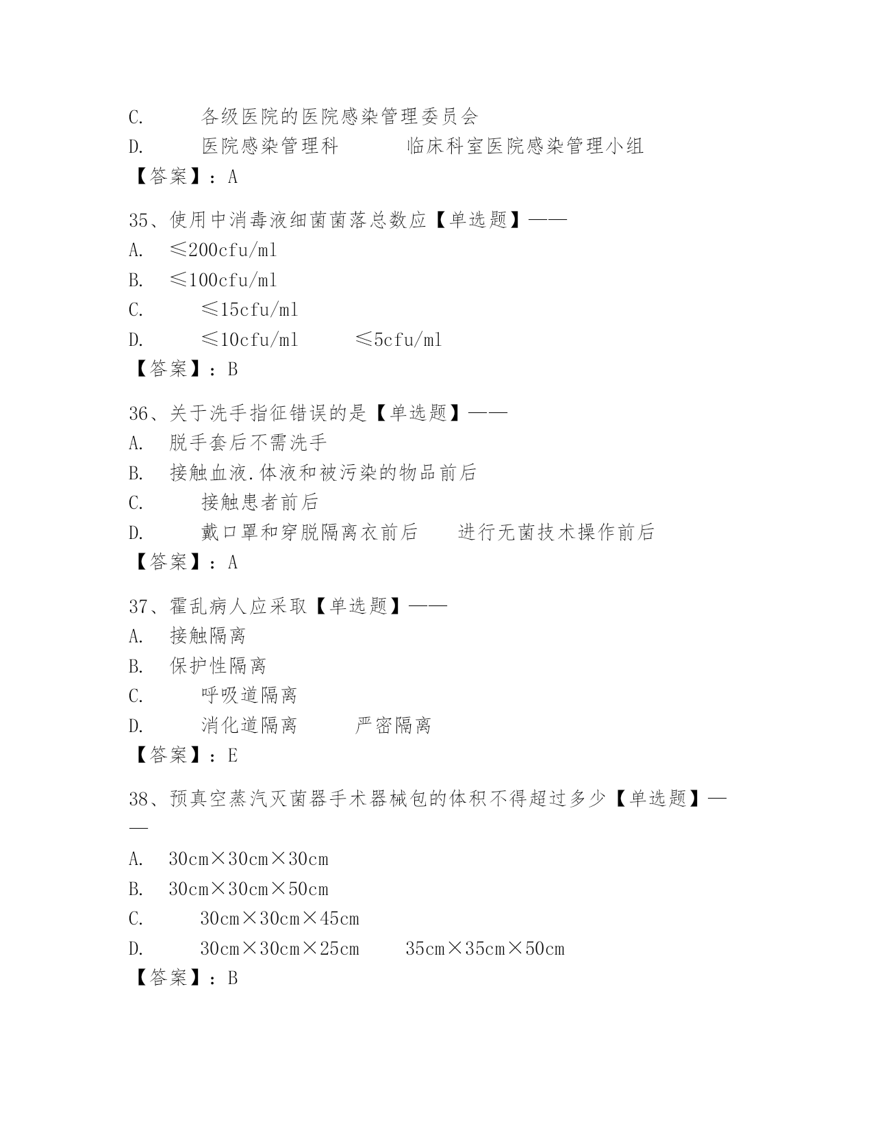2024年公共卫生与预防医学题库第一部分单选题(200题)1、刘某,被诊断为霍乱,对其应该采取的隔离方式是【单选题】——A.消化道隔离B.严密隔离C.昆虫隔离D.保护性隔离呼吸道隔离【答案】:B2、关于医院感染知识培训错误的是【单选题】——A.培训内容包括管理知识和专业知识B.非专职人员每年不少于2小时培训C.培训对象包括管理.医务.工勤人员D.实习医师必须培训进修医师必须培训【答案】:B3、重症监护病房【单选题】——A.≤10≤5≤5B.≤200≤5≤5C.≤500≤10≤10D.=-≤15≤15【答案