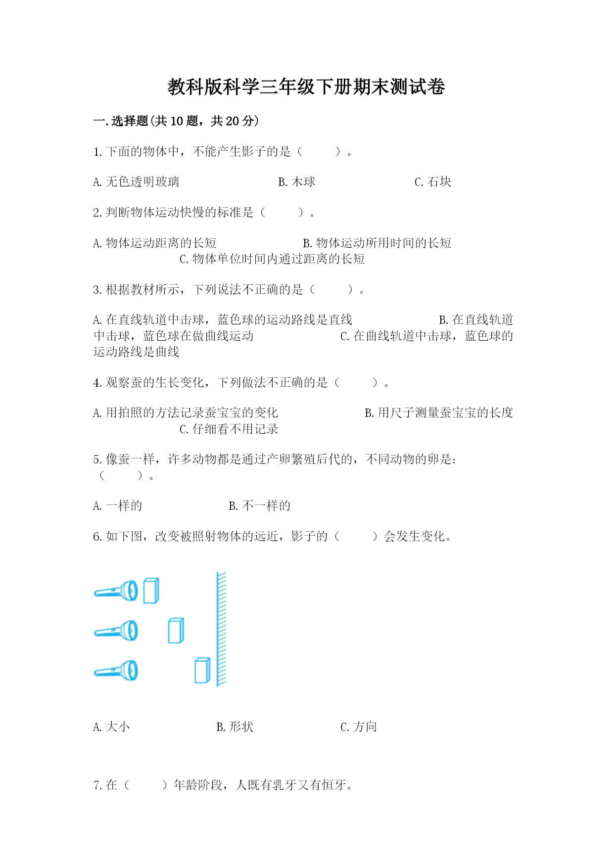 教科版科学三年级下册期末测试卷一.选择题(共10题,共20分)1.下面的物体中,不能产生影子的是()。A.无色透明玻璃B.木球C.石块2.判断物体运动快慢的标准是()。A.物体运动距离的长短B.物体运动所用时间的长短C.物体单位时间内通过距离的长短3.根据教材所示,下列说法不正确的是()。A.在直线轨道中击球,蓝色球的运动路线是直线B.在直线轨道中击球,蓝色球在做曲线运动C.在曲线轨道中击球,蓝色球的运动路线是曲线4.观察蚕的生长变化,下列做法不正确的是()。A.用拍照的方法记录蚕宝宝的变化B.用尺子测量