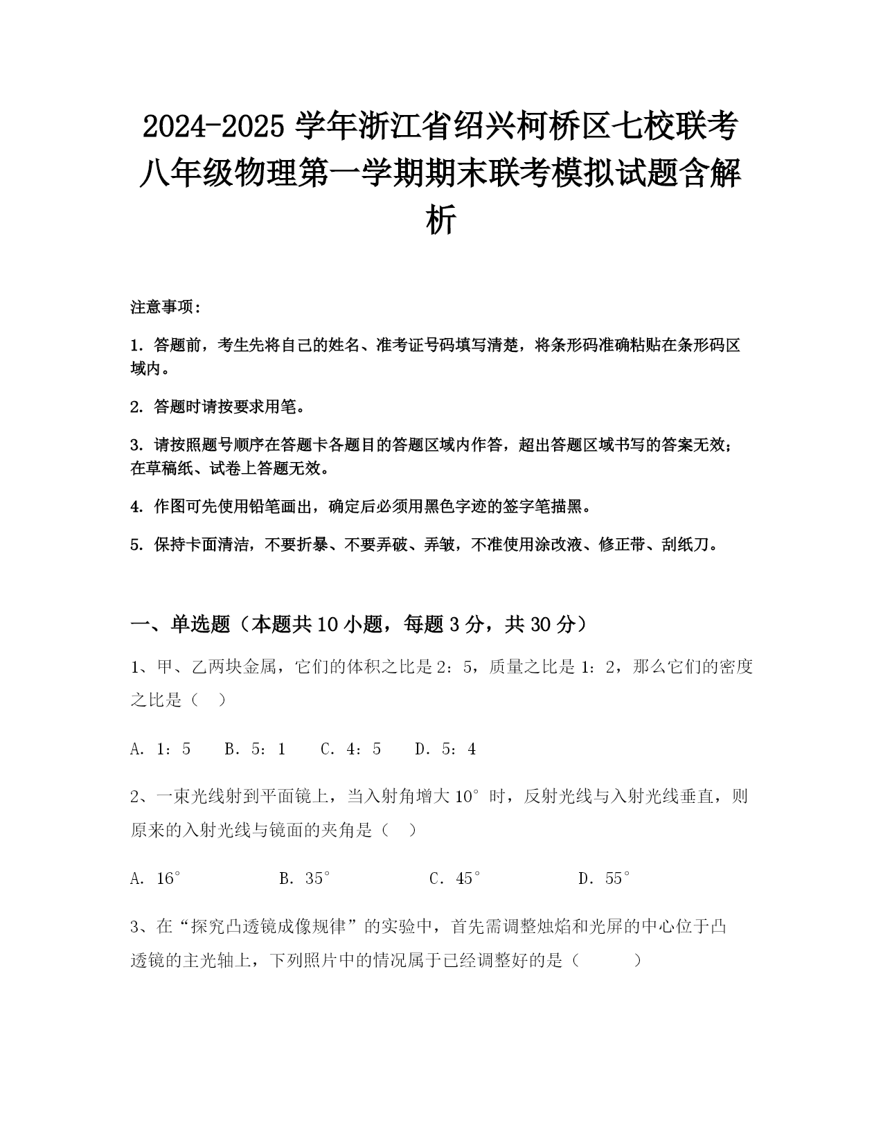 2024-2025学年浙江省绍兴柯桥区七校联考八年级物理第一学期期末统考模拟试题含解析注意事项:1.答题前,考生先将自己的姓名、准考证号码填写清楚,将条形码准确粘贴在条形码区域内。2.答题时请按要求用笔。3.请按照题号顺序在答题卡各题目的答题区域内作答,超出答题区域书写的答案无效;在草稿纸、试卷上答题无效。4.作图可先使用铅笔画出,确定后必须用黑色字迹的签字笔描黑。5.保持卡面清洁,不要折暴、不要弄破、弄皱,不准使用涂改液、修正带、刮纸刀。一、单选题(本题共10小题,每题3分,共30分)1、自然界中有许多